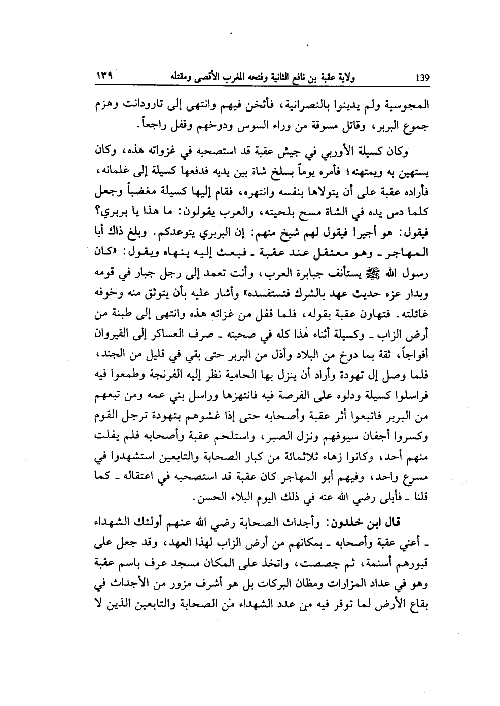 قَالَ ابْن خلدون واجداث الصَّحَابَة رَضِي الله عَنْهُم أُولَئِكَ الشُّهَدَاء أَعنِي عقبَة وَأَصْحَابه بمكانهم من أَرض الزاب لهَذَا الْعَهْد وَقد جعل على قُبُورهم أسنمة ثمَّ جصصت وَاتخذ على الْمَكَان مَسْجِد عرف باسم عقبَة وَهُوَ فِي عداد المزارات ومظان البركات بل هُوَ أشرف مزور من الأجداث فِي بقاع الأَرْض لما توفر فيهه من عدد الشُّهَدَاء من الصَّحَابَة وَالتَّابِعِينَ الَّذين لَا