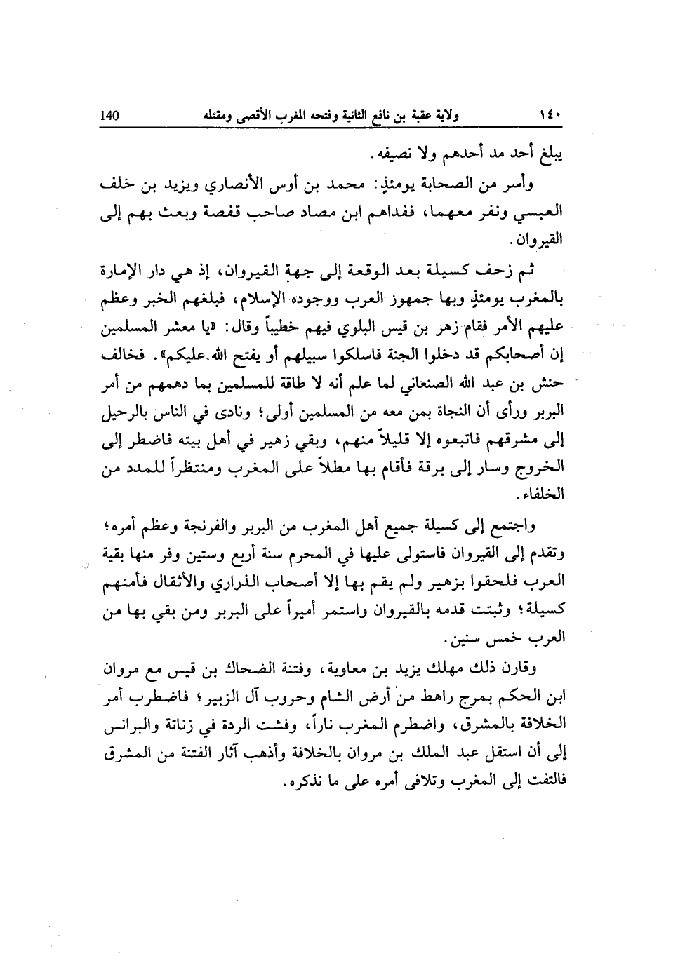 ثمَّ زحف كسيلة بعد الْوَقْعَة إِلَى جِهَة القيروان إِذْ هِيَ دَار الْإِمَارَة بالمغرب يَوْمئِذٍ وَبهَا جُمْهُور الْعَرَب ووجوده الْإِسْلَام فَبَلغهُمْ الْخَبَر وَعظم عَلَيْهِم الْأَمر فَقَامَ زهر بن قيس البلوي فيهم خَطِيبًا وَقَالَ يَا معشر الْمُسلمين إِن أصحابكم قد دخلُوا الْجنَّة فاسلكوا سبيلهم أَو يفتح الله عَلَيْكُم فَخَالف حَنش بن عبد الله الصَّنْعَانِيّ لما علم أَنه لَا طَاقَة للْمُسلمين بِمَا دهمهم من أَمر البربر وَرَأى أَن النجَاة بِمن مَعَه من الْمُسلمين أولى ونادى فِي النَّاس بالرحيل إِلَى مشرقهم فَاتَّبعُوهُ إِلَّا قَلِيلا مِنْهُم وَبَقِي زُهَيْر فِي أهل بَيته فاضطر إِلَى الْخُرُوج وَسَار إِلَى برقة فَأَقَامَ بهَا مطلا على الْمغرب ومنتظرا للمدد من الْخُلَفَاء