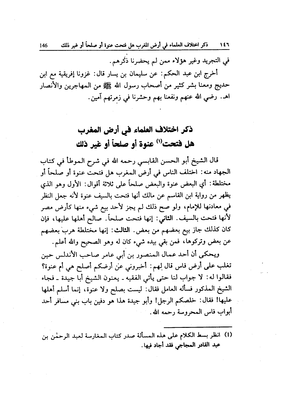 قَالَ الشَّيْخ أَبُو الْحسن الْقَابِسِيّ رَحمَه الله فِي شرح الْمُوَطَّأ فِي كتاب الْجِهَاد مِنْهُ اخْتلف النَّاس فِي أَرض الْمغرب هَل فتحت عنْوَة أَو صلحا أَو مختلطة اي الْبَعْض عنْوَة وَالْبَعْض صلحا على ثَلَاثَة اقوال الأول وَهُوَ الَّذِي يظْهر من روايتة ابْن الْقَاسِم عَن مَالك أَنَّهَا فتحت بِالسَّيْفِ عنْوَة لِأَنَّهُ جعل النّظر فِي معادنها للْإِمَام وَلَو صَحَّ ذَلِك لم يجز لأحد بيع شَيْء مِنْهَا كأرض مصر لِأَنَّهَا فتحت بِالسَّيْفِ الثَّانِي إِنَّهَا فتحت صلحا صَالح أَهلهَا عَلَيْهَا فَإِن كَانَ كَذَلِك جَازَ بيع بَعضهم من بعض الثَّالِث إِنَّهَا مختلطة هرب بَعضهم عَن بعض وتركوها فَمن بَقِي بِيَدِهِ شَيْء كَانَ لَهُ وَهُوَ الصَّحِيح وَالله أعلم