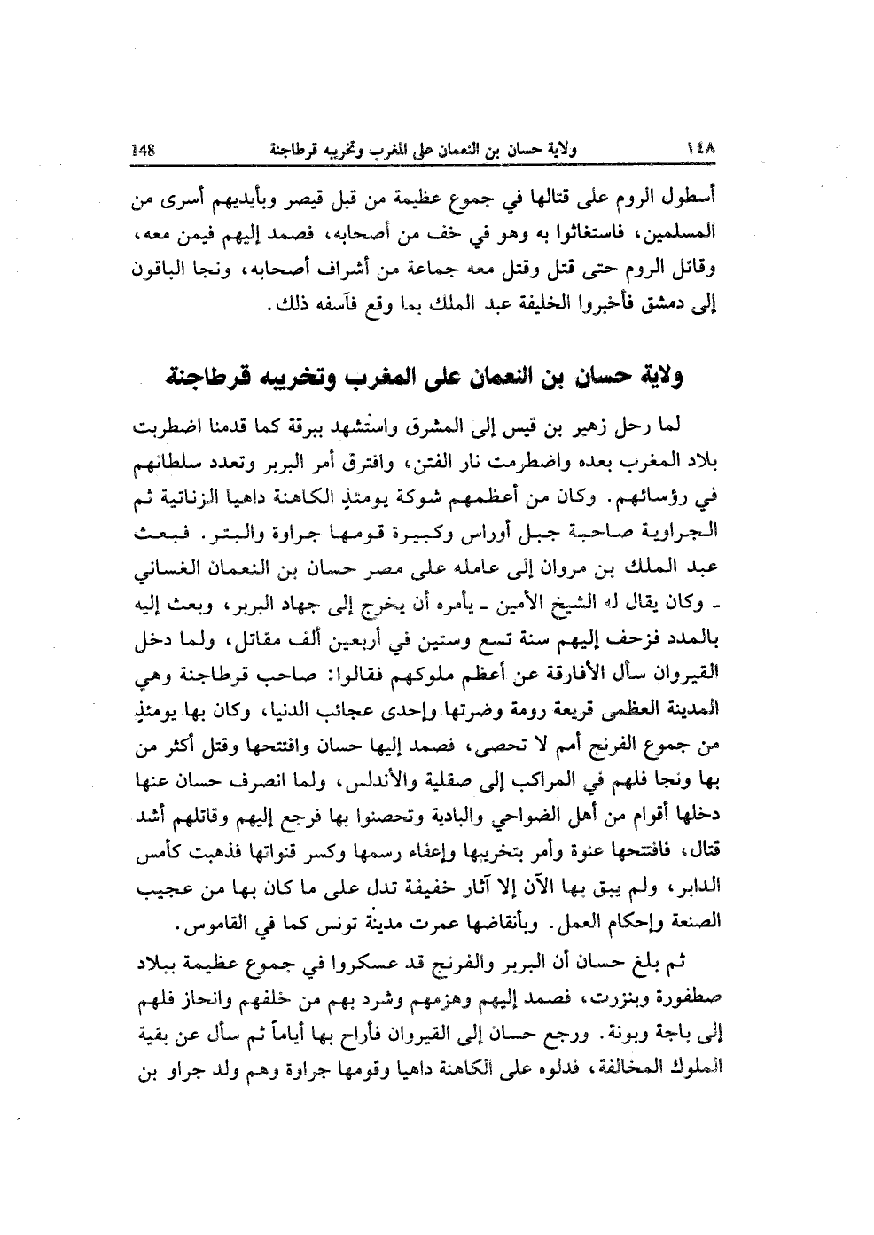 لما رَحل زُهَيْر بن قيس إِلَى الْمشرق وَاسْتشْهدَ ببرقة كَمَا قدمنَا واضطرمت بِلَاد الْمغرب بعده واضطربت نَار الْفِتَن وافترق أَمر البربر وتعدد سلطانهم فِي رُؤَسَائِهِمْ وَكَانَ من أعظمهم هم شَوْكَة يَوْمئِذٍ الكاهنة داهيا الزناتية ثمَّ الجراوية صَاحِبَة جبل أوراس وكبيرة قَومهَا جراوة والبتر فَبعث عبد الْملك بن مَرْوَان إِلَى عَامله على مصر حسان بن النُّعْمَان الغساني وَكَانَ يُقَال لَهُ الشَّيْخ الْأمين يَأْمُرهُ أَن يخرج إِلَى جِهَاد البربر وَبعث إِلَيْهِ بالمدد فزحف إِلَيْهِم سنة تسع وَسِتِّينَ فِي أَرْبَعِينَ ألف مقَاتل وَلما دخل القيروان سَأَلَ الأفارقة عَن أعظم مُلُوكهمْ فَقَالُوا صَاحب قرطاجنة وَهِي الْمَدِينَة الْعُظْمَى قريعة رومة وضرتها وَإِحْدَى عجائب الدُّنْيَا وَكَانَ با يَوْمئِذٍ من جموع الفرنج أُمَم لَا تحصى فصمد إِلَيْهَا حسان وافتتحها وَقتل أَكثر من بهَا وَنَجَا فَلهم فِي المراكب إِلَى صقلية والأندلس وَلما انْصَرف حسان عَنْهَا دَخلهَا أَقوام من أهل الضواحي والبادية وتحصنوا بهَا فَرجع إِلَيْهِم وَقَاتلهمْ أَشد قتال فافتتحها عنْوَة وَأمر بتخريبها وإعفاء رسمها وَكسر قنواتها فَذَهَبت كأمس الدابر وَلم يبْق بهَا الْآن إِلَّا آثَار خَفِيفَة تدل على مَا كَانَ بهَا من عَجِيب الصَّنْعَة وإحكام الْعَمَل وبأنقاضها عمرت مَدِينَة تونس كَمَا فِي الْقَامُوس