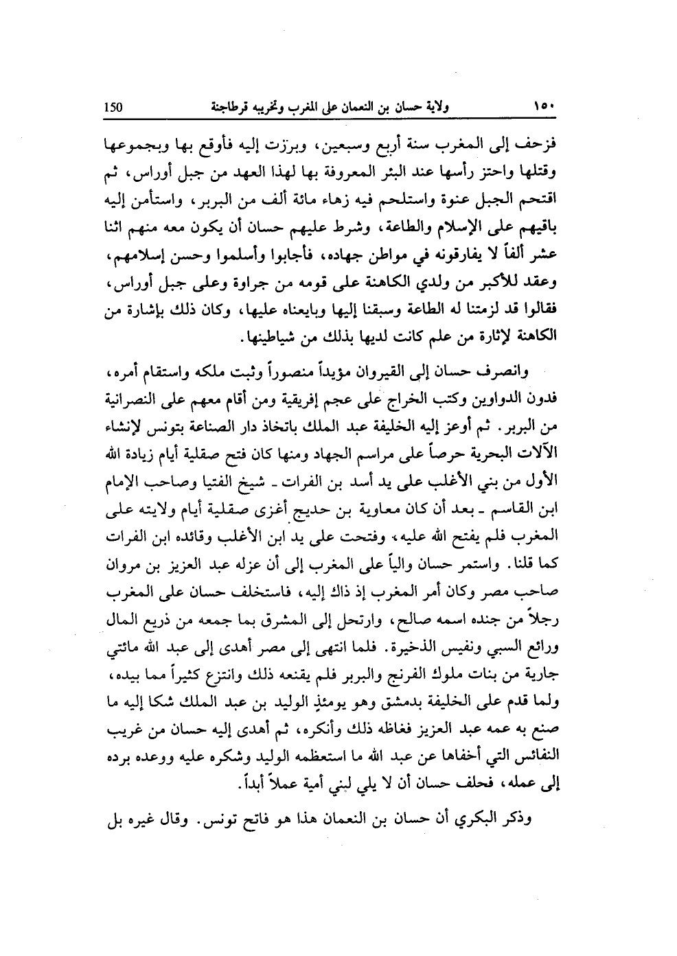 فزحف إِلَى الْمغرب سنة أَربع وَسبعين وبرزت إِلَيْهِ فأوقع بهَا وبجموعها وقتلها واحتز رَأسهَا عِنْد الْبِئْر الْمَعْرُوفَة بهَا لهَذَا الْعَهْد من جبل أوراس ثمَّ اقتحم الْجَبَل عنْوَة واستلحم فِيهِ زهاء مائَة ألف من البربر وَاسْتَأْمَنَ إِلَيْهِ باقيهم على الْإِسْلَام وَالطَّاعَة وَشرط عَلَيْهِم حسان أَن يكون مَعَه مِنْهُم اثْنَا عشر ألفا لَا يفارقونه فِي مَوَاطِن جهاده فَأَجَابُوا وَأَسْلمُوا وَحسن إسْلَامهمْ وَعقد للأكبر من وَلَدي الكاهنة على قومه من جراوة وعَلى جبل أوراس فَقَالُوا قد لزمتنا لَهُ الطَّاعَة وسبقنا إِلَيْهَا وبايعناه عَلَيْهَا وَكَانَ ذَلِك بِإِشَارَة من الكاهنة لإثارة من علم كَانَت لَدَيْهَا بذلك من شياطينها