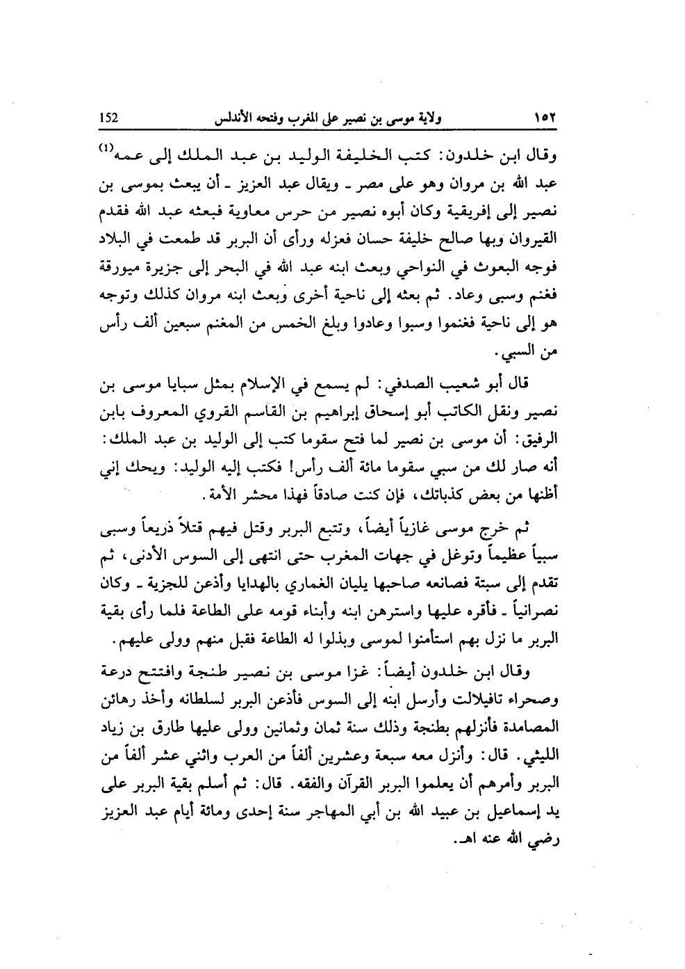 وَقَالَ ابْن خلدون أَيْضا غزا مُوسَى بن نصير طنجة وافتتح درعة وصحراء تافيلالت وَأرْسل ابْنه إِلَى السوس فأذعن البربر لسلطانه وَأخذ رهائن المصامدة فأنزلهم بطنجة وَذَلِكَ سنة ثَمَان وَثَمَانِينَ وَولى عَلَيْهَا طَارق بن زِيَاد اللَّيْثِيّ قَالَ وَأنزل مَعَه سَبْعَة وَعشْرين ألفا من الْعَرَب واثني عشر ألفا من البربر وَأمرهمْ ان يعلمُوا البربر الْقُرْآن وَالْفِقْه قَالَ ثمَّ أسلم بَقِيَّة البربرعلى يَد إِسْمَاعِيل بن عبيد الله بن أبي المُهَاجر سنة إِحْدَى وَمِائَة أَيَّام عبد الْعَزِيز رَضِي الله عَنهُ اه