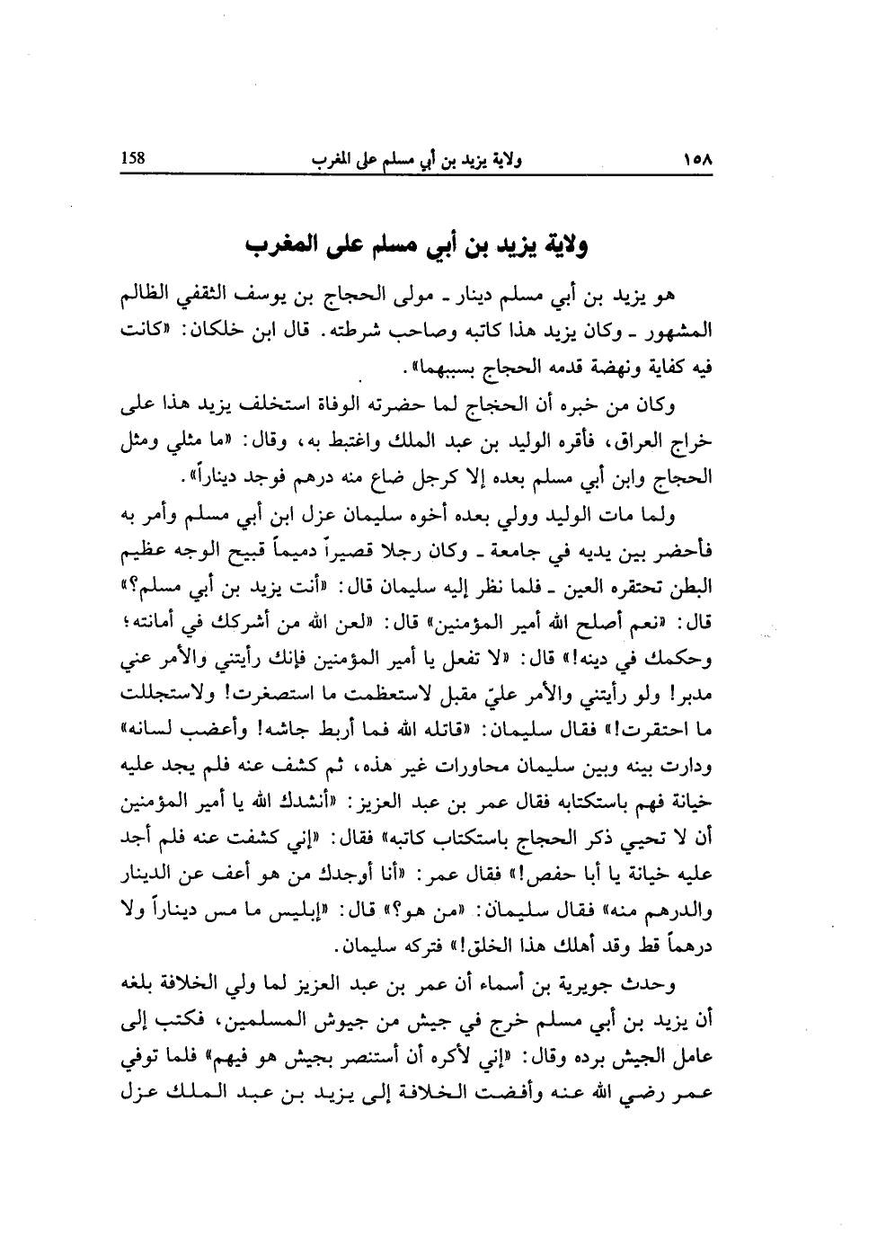 وَلما مَاتَ الْوَلِيد وَولي بعده أَخُوهُ سُلَيْمَان عزل ابْن أبي مُسلم وَأمر بِهِ فأحضر بَين يَدَيْهِ فِي جَامِعَة وَكَانَ رجلا قَصِيرا دميما قَبِيح الْوَجْه عَظِيم الْبَطن تحتقره الْعين فَلَمَّا نظر إِلَيْهِ سُلَيْمَان قَالَ أَنْت يزِيد بن أبي مُسلم قَالَ نعم اصلح الله أَمِير الْمُؤمنِينَ قَالَ لعن الله من أشركك فِي أَمَانَته وحكمك فِي دينه قَالَ لَا تفعل يَا أَمِير الْمُؤمنِينَ فَإنَّك رايتني وَالْأَمر عني مُدبر وَلَو رَأَيْتنِي وَالْأَمر عَليّ مقبل لاستعظمت مَا استصغرت ولاستجللت مَا احتقرت فَقَالَ سُلَيْمَان قَاتله الله فَمَا أربط جاشه وأعضب لِسَانه ودارت بَينه وَبَين سُلَيْمَان محاورات غير هَذِه ثمَّ كشف عَنهُ فَلم يجد عَلَيْهِ خِيَانَة فهم باستكتابه فَقَالَ عمر بن عبد الْعَزِيز أنْشدك الله يَا أَمِير الْمُؤمنِينَ أَن لَا تحيي ذكر الْحجَّاج باستكتاب كَاتبه فَقَالَ إِنِّي كشفت عَنهُ فَلم أجد عَلَيْهِ خِيَانَة يَا أَبَا حَفْص فَقَالَ عمر أَنا أوجدك من هُوَ أعف عَن الدِّينَار وَالدِّرْهَم مِنْهُ فَقَالَ سُلَيْمَان من هُوَ قَالَ إِبْلِيس مَا مس دِينَارا وَلَا درهما قطّ وَقد أهلك هَذَا الْخلق فَتَركه سُلَيْمَان