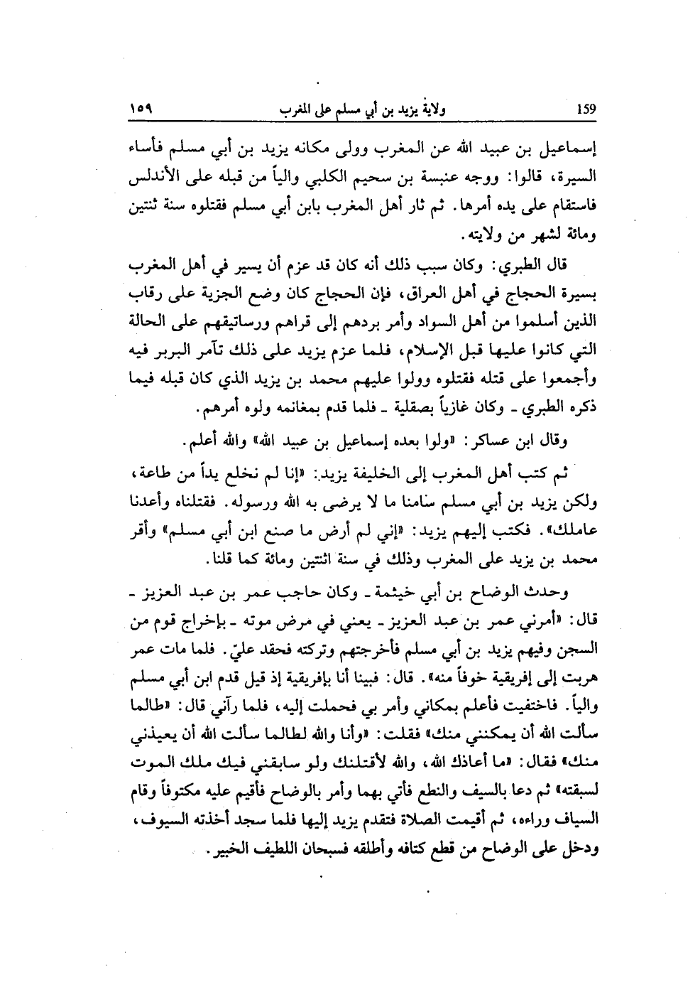 إِسْمَاعِيل بن عبيد الله عَن الْمغرب وَولى مَكَانَهُ يزِيد بن أبي مُسلم فأساء السِّيرَة قَالُوا وَوجه عَنْبَسَة بن سحيم الْكَلْبِيّ واليا من قبله على الأندلس فاستقام على يَده أمرهَا ثمَّ ثار أهل الْمغرب بِابْن أبي مُسلم فَقَتَلُوهُ سنة ثِنْتَيْنِ وَمِائَة لشهر من ولَايَته