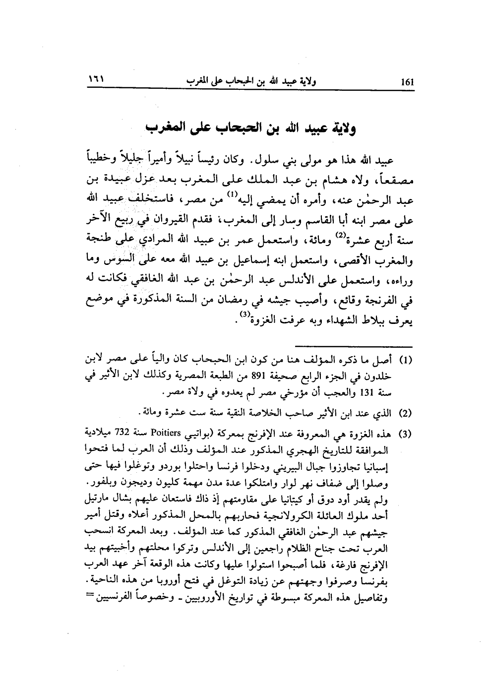 عبيد الله هَذَا هُوَ مولى بني سلول وَكَانَ رَئِيسا نبيلا وأميرا جَلِيلًا وخطيبا مصقعا ولاه هِشَام بن عبد الْملك على الْمغرب بعد عزل عُبَيْدَة بن عبد الرَّحْمَن عَنهُ وَأمره أَن يمْضِي إِلَيْهِ من مصر فاستخلف عبيد الله على مصر ابْنه أَبَا الْقَاسِم وَسَار إِلَى الْمغرب فَقدم القيروان فِي ربيع الآخر سنة أَربع عشرَة وَمِائَة وَاسْتعْمل عمر بن عبيد الله الْمرَادِي على طنجة وَالْمغْرب الْأَقْصَى وَاسْتعْمل ابْنه إِسْمَاعِيل بن عبيد الله مَعَه على السوس وَمَا وَرَاءه وَاسْتعْمل على الأندلس عبد الرَّحْمَن بن عبد الله الغافقي فَكَانَت لَهُ فِي الفرنجة وقائع وَأُصِيب جَيْشه فِي رَمَضَان من السّنة الْمَذْكُورَة فِي مَوضِع يعرف ببلاط لشهداء وَبِه عرفت الْغَزْوَة