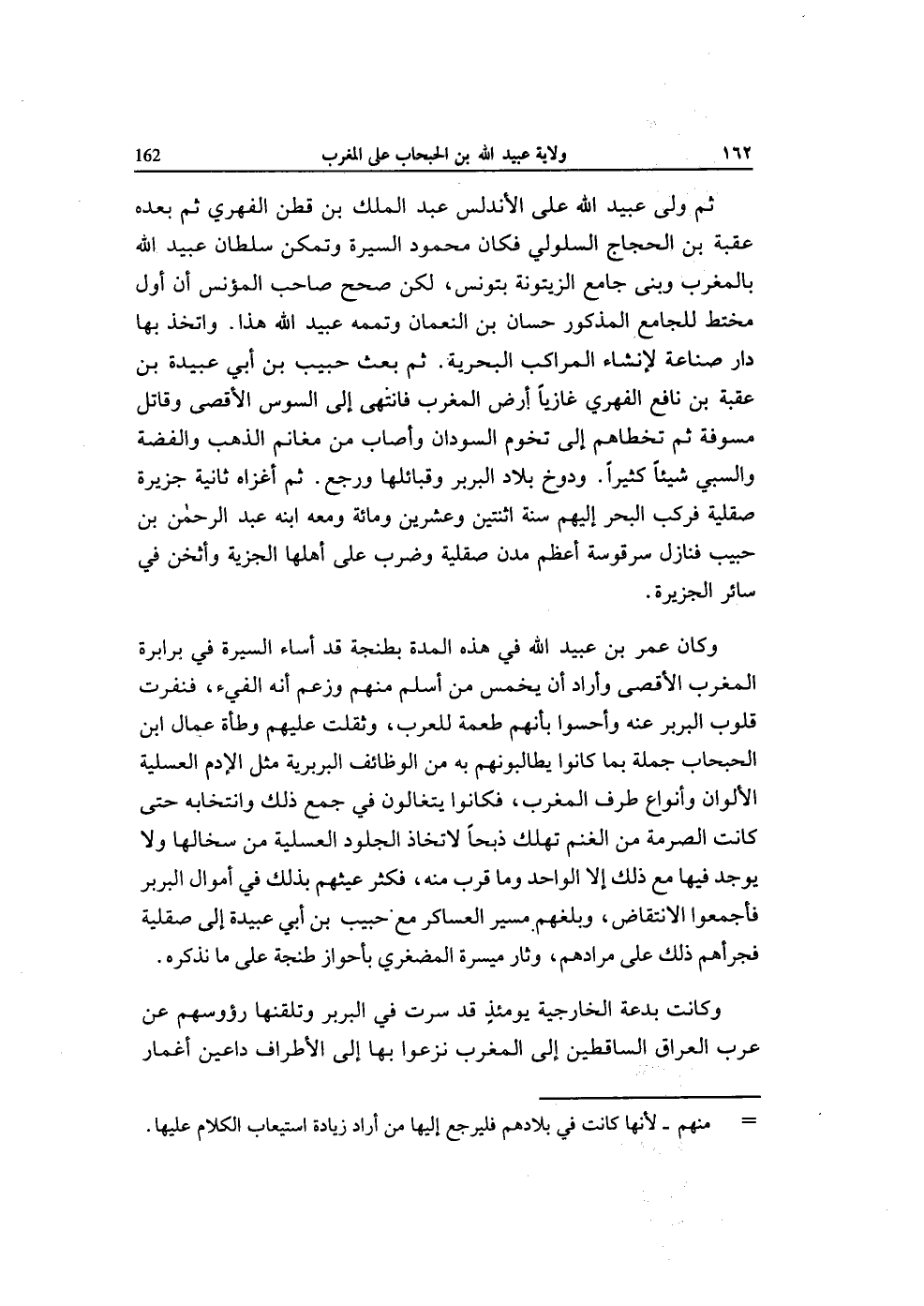 ثمَّ ولى عبيد الله على الأندلس عبد الْملك بن قطن الفِهري ثمَّ بعده عقبَة بن الْحجَّاج السَّلُولي فَكَانَ مَحْمُود السِّيرَة وَتمكن سُلْطَان عبيد الله بالمغرب وَبنى جَامع الزيتونة بتونس لَكِن صحّح صَاحب المؤنس أَن أول مختط للجامع الْمَذْكُور حسان بن النُّعْمَان وتممه عبيد الله هَذَا وَاتخذ بهَا دَار صناعَة لإنشاء المراكب البحرية ثمَّ بعث حبيب بن أبي عُبَيْدَة بن عقبَة بن نَافِع الفِهري غازيا أَرض الْمغرب فَانْتهى إِلَى السوس الْأَقْصَى وَقَاتل مسوفة ثمَّ تخطاهم إِلَى تخوم السودَان وَأصَاب من مَغَانِم الذَّهَب وَالْفِضَّة والسبي شَيْئا كثيرا ودوخ بِلَاد البربر وقبائلها وَرجع ثمَّ أغزاه ثَانِيَة جَزِيرَة صقلية فَركب الْبَحْر إِلَيْهِم سنة اثْنَتَيْنِ وَعشْرين وَمِائَة وَمَعَهُ ابْنه عبد الرَّحْمَن بن حبيب فنازل سرقوسة أعظم مدن صقلية وَضرب على أَهلهَا الْجِزْيَة وأثخن فِي سَائِر الجزيرة