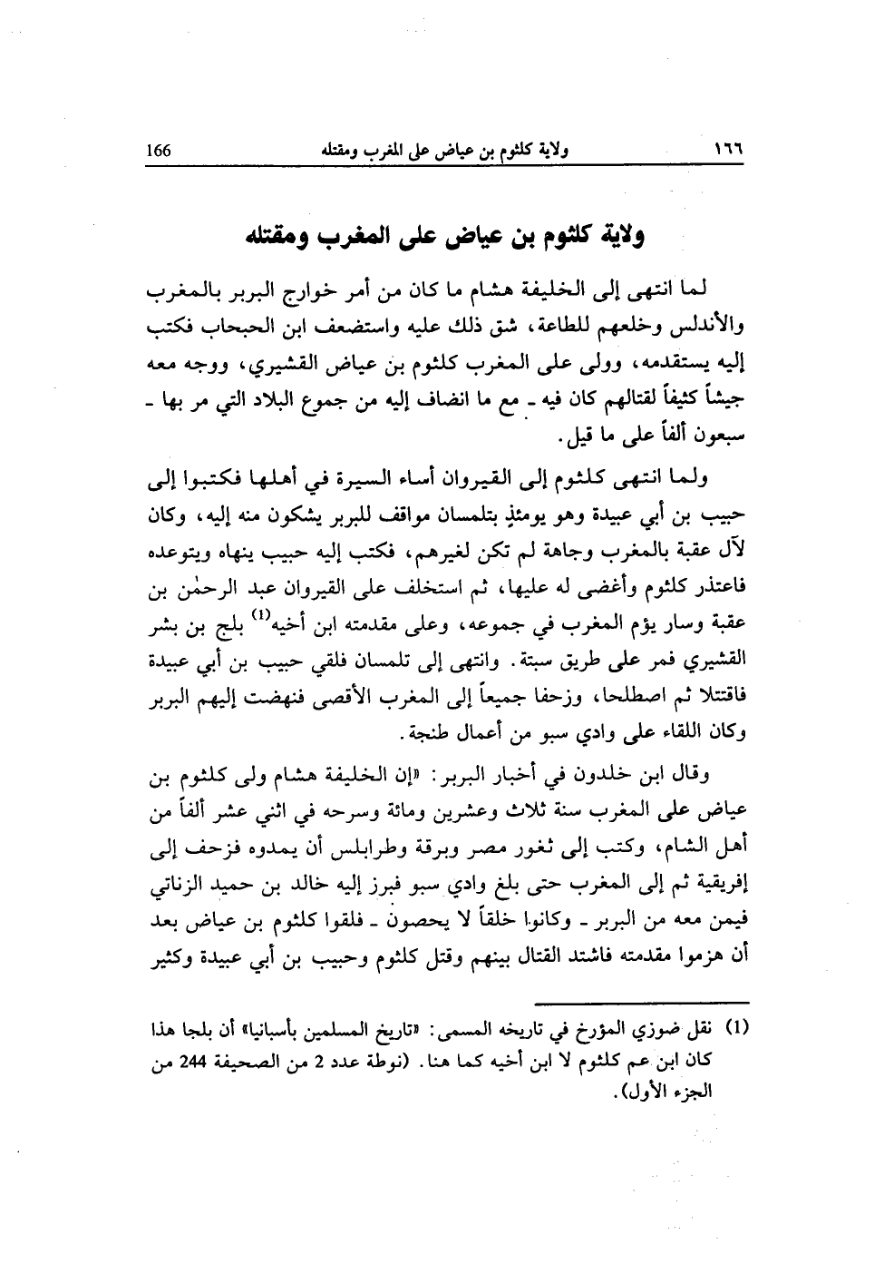 وَقَالَ ابْن خلدون فِي أَخْبَار البربر إِن الْخَلِيفَة هِشَام ولى كُلْثُوم بن عِيَاض على الْمغرب سنة ثَلَاث وَعشْرين وَمِائَة سرحه فِي اثْنَي عشر ألفا من أهل الشَّام وَكتب إِلَى ثغور مصر وبرقة وطرابلس أَن يمدوه فزحف إِلَى إفريقية ثمَّ إِلَى الْمغرب حَتَّى بلغ وَادي سبو فبرز إِلَيْهِ خَالِد بن حميد الزناتي فِيمَن مَعَه من البربر وَكَانُوا خلقا لَا يُحصونَ فَلَقوا كُلْثُوم بن عِيَاض بعد أَن هزموا مقدمته فَاشْتَدَّ الْقِتَال بَينهم وَقتل كُلْثُوم وحبِيب بن أبي عُبَيْدَة وَكثير