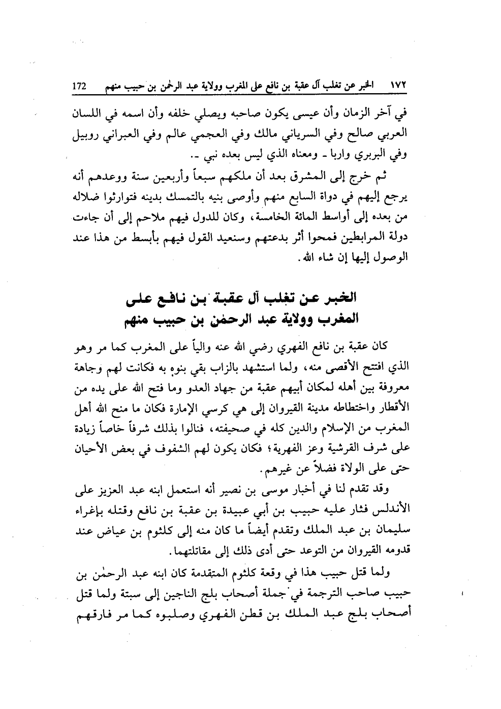 الْخَبَر عَن تغلب آل عقبَة بن نَافِع على الْمغرب وَولَايَة عبد الرَّحْمَن بن حبيب مِنْهُم