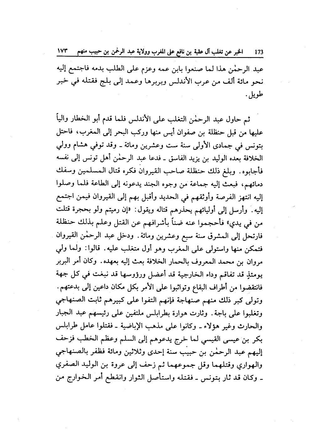 ثمَّ حاول عبد الرَّحْمَن التغلب على الأندلس فَلَمَّا قدم أَبُو الخطار واليا عَلَيْهَا من قبل حَنْظَلَة بن صَفْوَان أيس مِنْهَا وَركب الْبَحْر إِلَى الْمغرب فاحتل بتونس فِي جُمَادَى الأولى سنة سِتّ وَعشْرين وَمِائَة وَقد توفّي هِشَام وَولي الْخلَافَة بعده الْوَلِيد بن يزِيد الْفَاسِق فَدَعَا عبد الرَّحْمَن أهل تونس إِلَى نَفسه فَأَجَابُوهُ وَبلغ ذَلِك حَنْظَلَة صَاحب القيروان فكره قتال الْمُسلمين وَسَفك دِمَائِهِمْ فَبعث إِلَيْهِ جمَاعَة من وُجُوه الْجند يَدعُونَهُ إِلَى الطَّاعَة فَلَمَّا وصلوا إِلَيْهِ انتهز الفرصة وأوثقهم فِي الْحَدِيد وَأَقْبل بهم إِلَى القيروان فِيمَن اجْتمع إِلَيْهِ وَأرْسل إِلَى أَوْلِيَائِهِمْ يُحَذرهُمْ قِتَاله وَيَقُول إِن رميتم وَلَو بحجرة قتلت من فِي يَدي فأحجموا عَنهُ ضنا بأشرافهم عَن الْقَتْل وَعلم بذلك حَنْظَلَة فارتحل إِلَى الْمشرق سنة سبع وَعشْرين وَمِائَة وَدخل عبد الرَّحْمَن القيروان فَتمكن مِنْهَا وَاسْتولى على الْمغرب وَهُوَ أول متغلب عَلَيْهِ قَالُوا وَلما ولي مَرْوَان بن مُحَمَّد الْمَعْرُوف بالحمار الْخلَافَة بعث إِلَيْهِ بعهده وَكَانَ أَمر البربر يَوْمئِذٍ قد تفاقم وداء الخارجية قد أعضل ورؤوسها قد نبغت فِي كل جِهَة فانتقضوا من أَطْرَاف الْبِقَاع وتواثبوا على الْأَمر بِكُل مَكَان داعين إِلَى بدعتهم وَتَوَلَّى كبر ذَلِك مِنْهُم صنهاجة فَإِنَّهُم التفوا على كَبِيرهمْ ثَابت الصنهاجي وتغلبوا على باجة وثارت هوارة بطرابلس ملتفين على رئيسهم عبد الْجَبَّار والْحَارث وَغير هَؤُلَاءِ وَكَانُوا على مَذْهَب الإباضية فَقتلُوا عَامل طرابلس بكر بن عِيسَى الْقَيْسِي لما خرج يَدعُوهُم إِلَى السّلم وَعظم الْخطب فزحف إِلَيْهِم عبد الرَّحْمَن بن حبيب سنة إِحْدَى وَثَلَاثِينَ وَمِائَة فظفر بالصنهاجي والهواري وقتلهما وَقل جموعهما ثمَّ زحف إِلَى عُرْوَة بن الْوَلِيد الصفري وَكَانَ قد ثار بتونس فَقتله واستأصل الثوار وَانْقطع أَمر الْخَوَارِج من