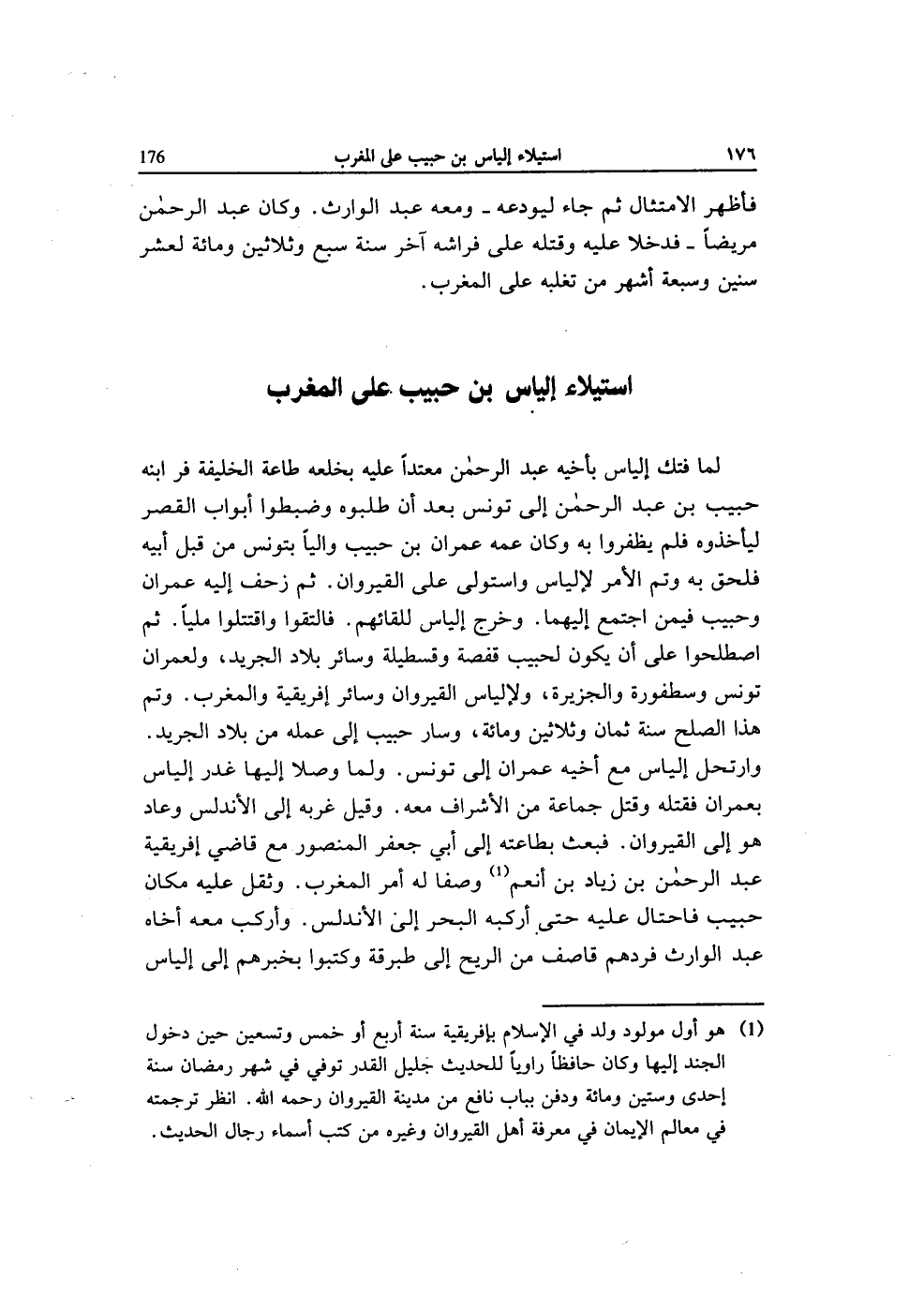 لما فتك إلْيَاس بأَخيه عبد الرَّحْمَن معتدا عَلَيْهِ بخلعه طَاعَة الْخَلِيفَة فر ابْنه حبيب بن عبد الرَّحْمَن إِلَى تونس بعد أَن طلبوه وضبطوا أَبْوَاب الْقصر ليأخذوه فَلم يظفروا بِهِ وَكَانَ عَمه عمرَان بن حبيب واليا بتونس من قبل أَبِيه فلحق بِهِ وَتمّ الْأَمر لإلياس وَاسْتولى على القيروان ثمَّ زحف إِلَيْهِ عمرَان وحبِيب فِيمَن اجْتمع إِلَيْهِمَا وَخرج إلْيَاس للقائهم فَالْتَقوا واقتتلوا مَلِيًّا ثمَّ اصْطَلحُوا على أَن يكون لحبيب قفصة وقسطيلة وَسَائِر بِلَاد الجريد ولعمران تونس وسطفورة والجزيرة ولإلياس القيروان وَسَائِر إفريقية وَالْمغْرب وَتمّ هَذَا الصُّلْح سنة ثَمَان وَثَلَاثِينَ وَمِائَة وَسَار حبيب إِلَى عمله من بِلَاد الجريد وارتحل إلْيَاس مَعَ أَخِيه عمرَان إِلَى تونس وَلما وصلا إِلَيْهَا غدر إلْيَاس بعمران فَقتله وَقتل جمَاعَة من الْأَشْرَاف مَعَه وَقيل غربه إِلَى الأندلس وَعَاد هُوَ إِلَى القيروان فَبعث بِطَاعَتِهِ إِلَى أبي جَعْفَر الْمَنْصُور مَعَ قَاضِي إفريقية عبد الرَّحْمَن بن زِيَاد بن أنعم وَصفا لَهُ أَمر الْمغرب وَثقل عَلَيْهِ مَكَان حبيب فاحتال عَلَيْهِ حَتَّى أركبه الْبَحْر إِلَى الأندلس وأركب مَعَه أَخَاهُ عبد الْوَارِث فردهم قاصف من الرّيح إِلَى طبرقة وَكَتَبُوا بخبرهم إِلَى إلْيَاس