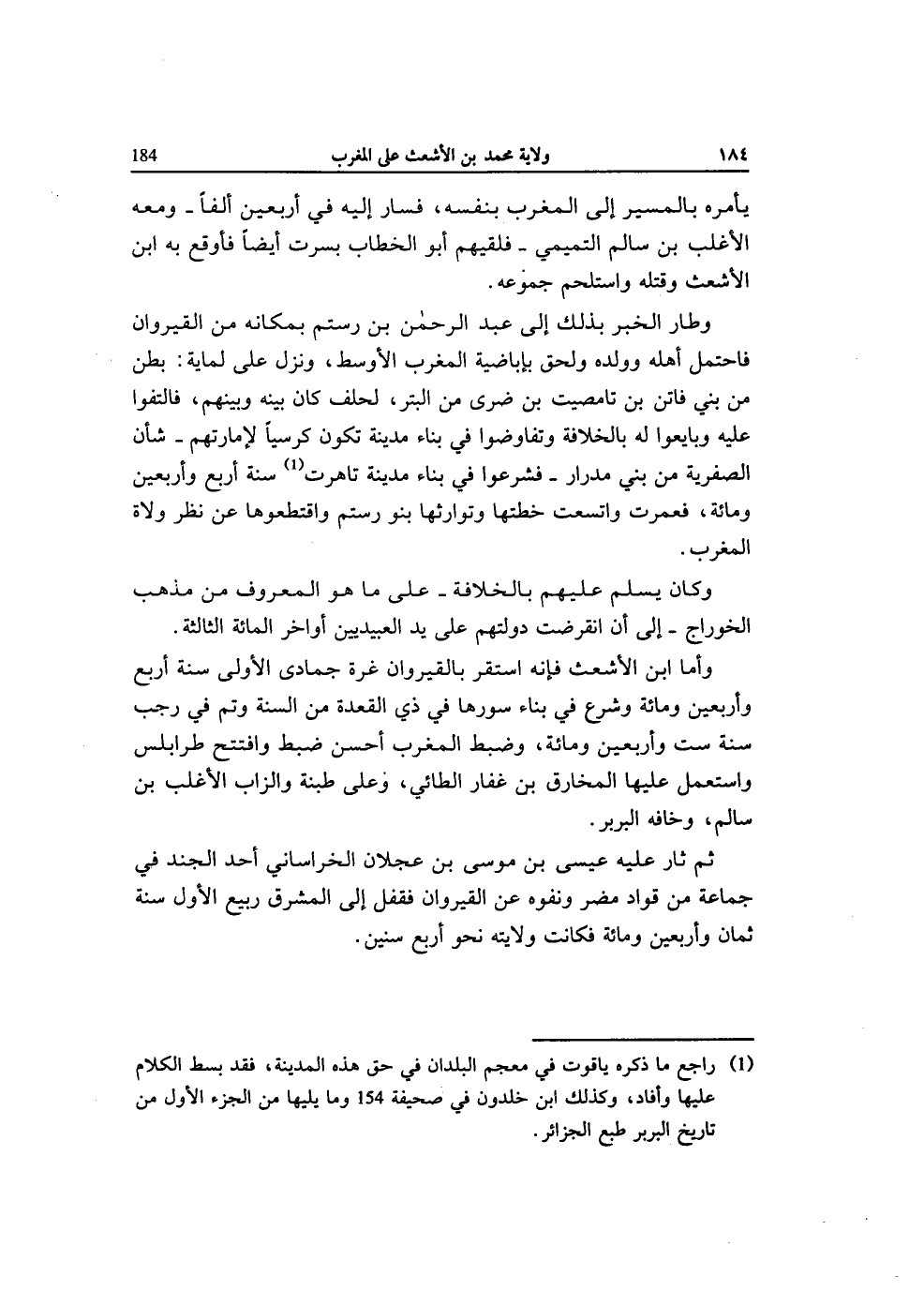 وَأما ابْن الْأَشْعَث فَإِنَّهُ اسْتَقر بالقيروان غرَّة جُمَادَى الأولى سنة أَربع وَأَرْبَعين وَمِائَة وَشرع فِي بِنَاء سورها فِي ذِي الْقعدَة من السّنة وَتمّ فِي رَجَب سنة سِتّ وَأَرْبَعين وَمِائَة وَضبط الْمغرب أحسن ضبط وافتتح طرابلس وَاسْتعْمل عَلَيْهَا الْمخَارِق بن غفار الطَّائِي وعَلى طبنة والزاب الْأَغْلَب بن سَالم وخافه البربر