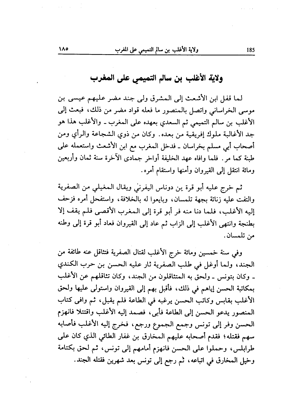لما قفل ابْن الْأَشْعَث إِلَى الْمشرق ولى جند مُضر عَلَيْهِم عِيسَى بن مُوسَى الْخُرَاسَانِي واتصل بالمنصور مَا فعله قواد مُضر من ذَلِك فَبعث إِلَى الْأَغْلَب بن سَالم التَّمِيمِي ثمَّ السَّعْدِيّ بعهده على الْمغرب والأغلب هَذَا هُوَ جد الأغالبة مُلُوك أفريقية من بعده على الْمغرب وَكَانَ من ذَوي الشجَاعَة والرأي وَمن صِحَاب أبي مُسلم بخراسان فَدخل الْمغرب مَعَ ابْن الْأَشْعَث وَاسْتَعْملهُ على طبنة كَمَا مر فَلَمَّا وافاه عهد الْخَلِيفَة أَوَاخِر جُمَادَى الْآخِرَة سنة ثَمَان وَأَرْبَعين وَمِائَة انْتقل إِلَى القيروان وأمنها واستقام أمره