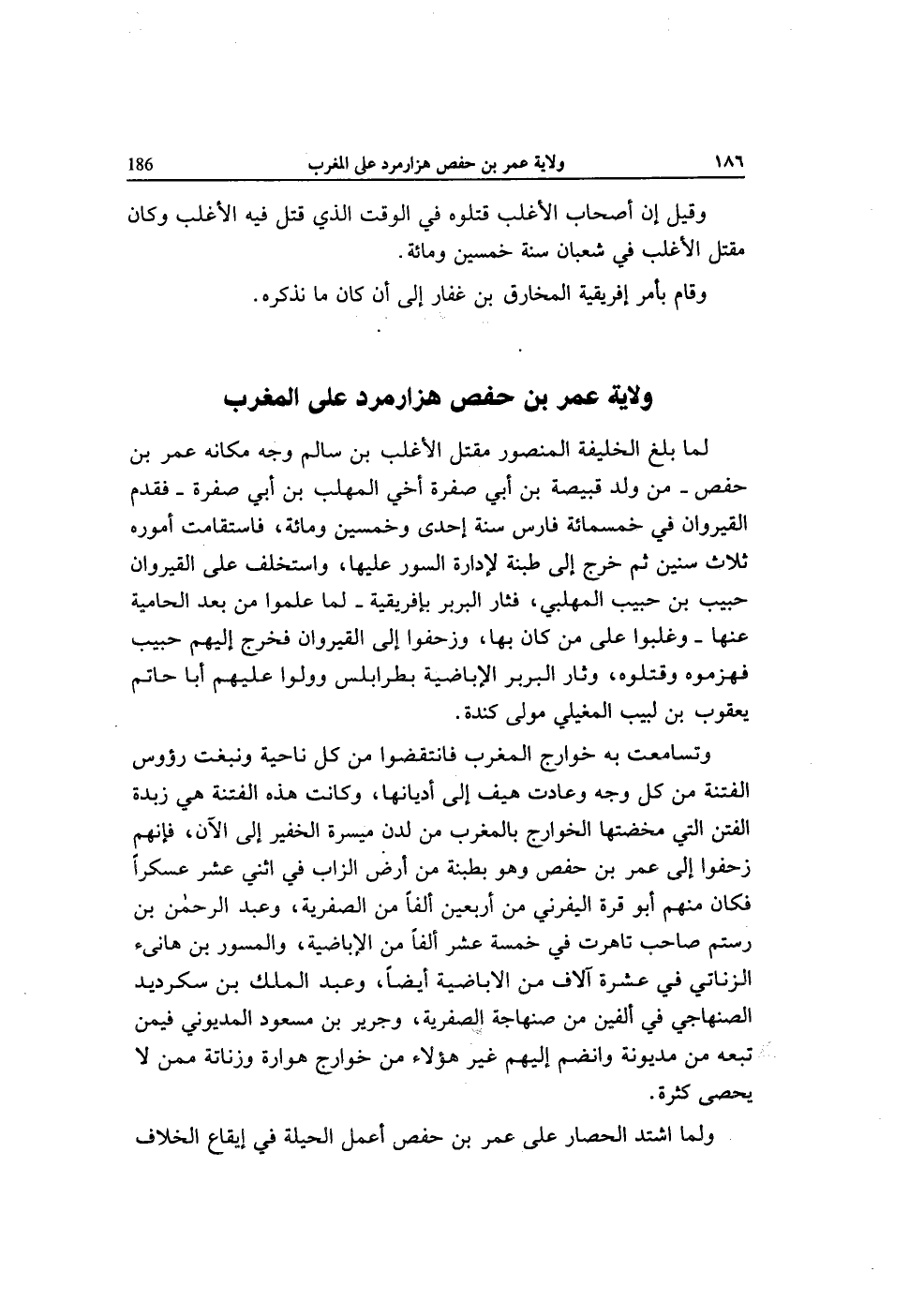 لما بلغ الْخَلِيفَة الْمَنْصُور مقتل الْأَغْلَب بن سَالم وَجه مَكَانَهُ عمر بن حَفْص من ولد قبيصَة بن أبي صفرَة أخي الْمُهلب بن أبي صفرَة فَقدم القيروان فِي خَمْسمِائَة فَارس سنة إِحْدَى وَخمسين وَمِائَة فاستقامت أُمُوره ثَلَاث سِنِين ثمَّ خرج إِلَى طبنة لإدارة السُّور عَلَيْهَا واستخلف على القيروان حبيب بن حبيب المهلبي فثار البربر بإفريقية لما علمُوا من بعد الحامية عَنْهَا وغلبوا على من كَانَ بهَا وزحفوا إِلَى القيروان فَخرج إِلَيْهِم حبيب فهزموه وقتلوه وثار البربر الإباضية بطرابلس وولوا عَلَيْهِم أَبَا حَاتِم يَعْقُوب بن لَبِيب المغيلي مولى كِنْدَة