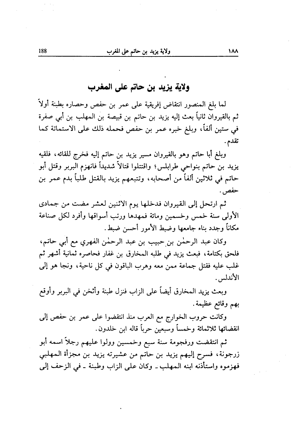 وَبلغ أَبَا حَاتِم وَهُوَ بالقيروان مسير يزِيد بن حَاتِم إِلَيْهِ فَخرج للقائه فَلَقِيَهُ يزِيد بن حَاتِم بنواحي طرابلس واقتتلوا قتالا شَدِيدا فَانْهَزَمَ البربر وَقتل أَبُو حَاتِم فِي ثَلَاثِينَ ألفا من أَصْحَابه وتتبعهم يزِيد بِالْقَتْلِ طلبا بِدَم عمر بن حَفْص