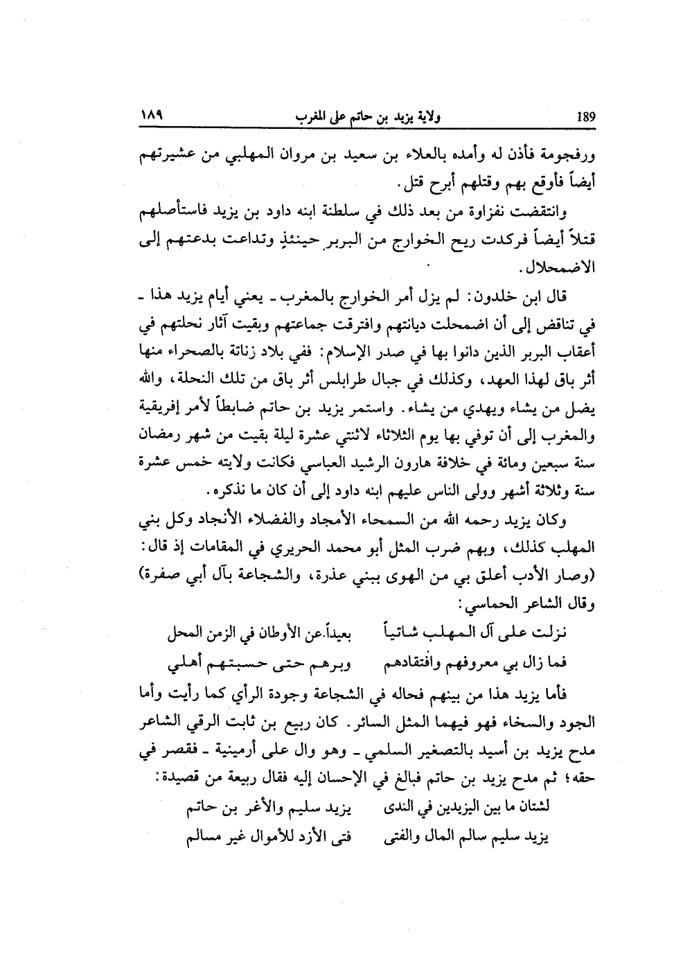 قَالَ ابْن خلدون لم يزل أَمر الْخَوَارِج بالمغرب يَعْنِي أَيَّام يزِيد هَذَا فِي تنَاقض إِلَى أَن اضمحلت ديانتهم وافترقت جَمَاعَتهمْ وَبقيت آثَار نحلتهم فِي أعقاب البربر الَّذين دانوا بهَا فِي صدر الْإِسْلَام فَفِي بِلَاد زناتة بالصحراء مِنْهَا أثر بَاقٍ لهَذَا الْعَهْد وَكَذَلِكَ فِي جبال طرابلس أثر بَاقٍ من تِلْكَ النحلة وَالله يضل من يَشَاء وَيهْدِي من يَشَاء وَاسْتمرّ يزِيد بن حَاتِم ضابطا لأمر إفريقية وَالْمغْرب إِلَى أَن توفّي بهَا يَوْم الثُّلَاثَاء لِاثْنَتَيْ عشرَة لَيْلَة بقيت من شهر رَمَضَان سنة سبعين وَمِائَة فِي خلَافَة هَارُون الرشيد العباسي فَكَانَت ولَايَته خمس عشرَة سنة وَثَلَاثَة أشهر وَولى النَّاس عَلَيْهِم ابْنه دَاوُد إِلَى أَن كَانَ مَا نذكرهُ