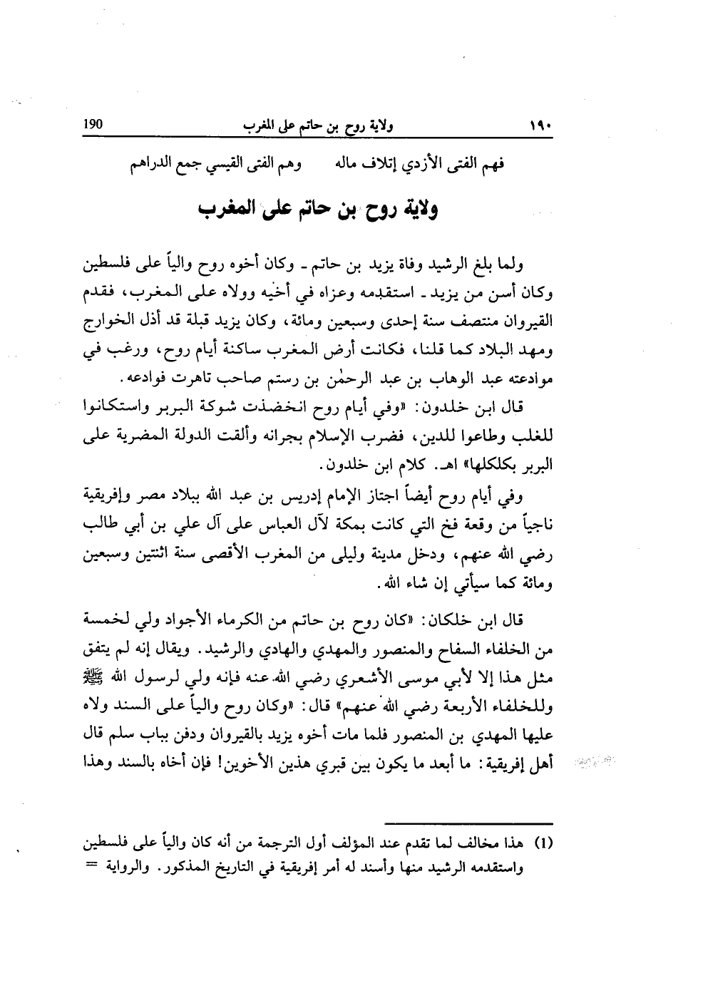 وَلما بلغ الرشيد وَفَاة يزِيد بن حَاتِم وَكَانَ أَخُوهُ روح واليا على فلسطين وَكَانَ أسن من يزِيد استقدمه وَعَزاهُ فِي أَخِيه وولاه على الْمغرب فَقدم القيروان منتصف سنة إِحْدَى وَسبعين وَمِائَة وَكَانَ يزِيد قبْلَة قد أذلّ الْخَوَارِج ومهد الْبِلَاد كَمَا قُلْنَا فَكَانَت أَرض الْمغرب سَاكِنة ايام روح وَرغب فِي موادعته عبد الْوَهَّاب بن عبد الرَّحْمَن بن رستم صَاحب تاهرت فوادعه
