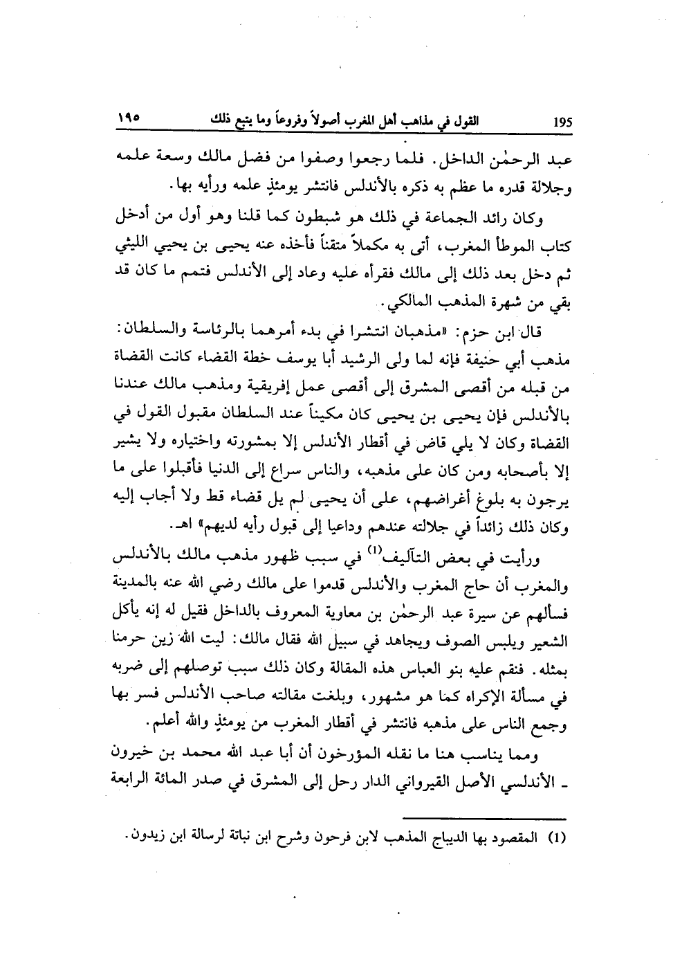 وَرَأَيْت فِي بعض التآليف فِي سَبَب ظُهُور مَذْهَب مَالك بالأندلس وَالْمغْرب أَن حَاج الْمغرب والأندلس قدمُوا على مَالك رَضِي الله عَنهُ بِالْمَدِينَةِ فَسَأَلَهُمْ عَن سيرة عبد الرَّحْمَن بن مُعَاوِيَة الْمَعْرُوف بالداخل فَقيل لَهُ إِنَّه يَأْكُل الشّعير ويلبس الصُّوف ويجاهد فِي سَبِيل الله فَقَالَ مَالك لَيْت الله زين حرمنا بِمثلِهِ فنقم عَلَيْهِ بَنو الْعَبَّاس هَذِه الْمقَالة وَكَانَ ذَلِك سَبَب توصلهم إِلَى ضربه فِي مَسْأَلَة الْإِكْرَاه كَمَا هُوَ مَشْهُور وَبَلغت مقَالَته صَاحب الأندلس فسر بهَا وَجمع النَّاس على مذْهبه فانتشر فِي أقطار الْمغرب من يَوْمئِذٍ وَالله أعلم