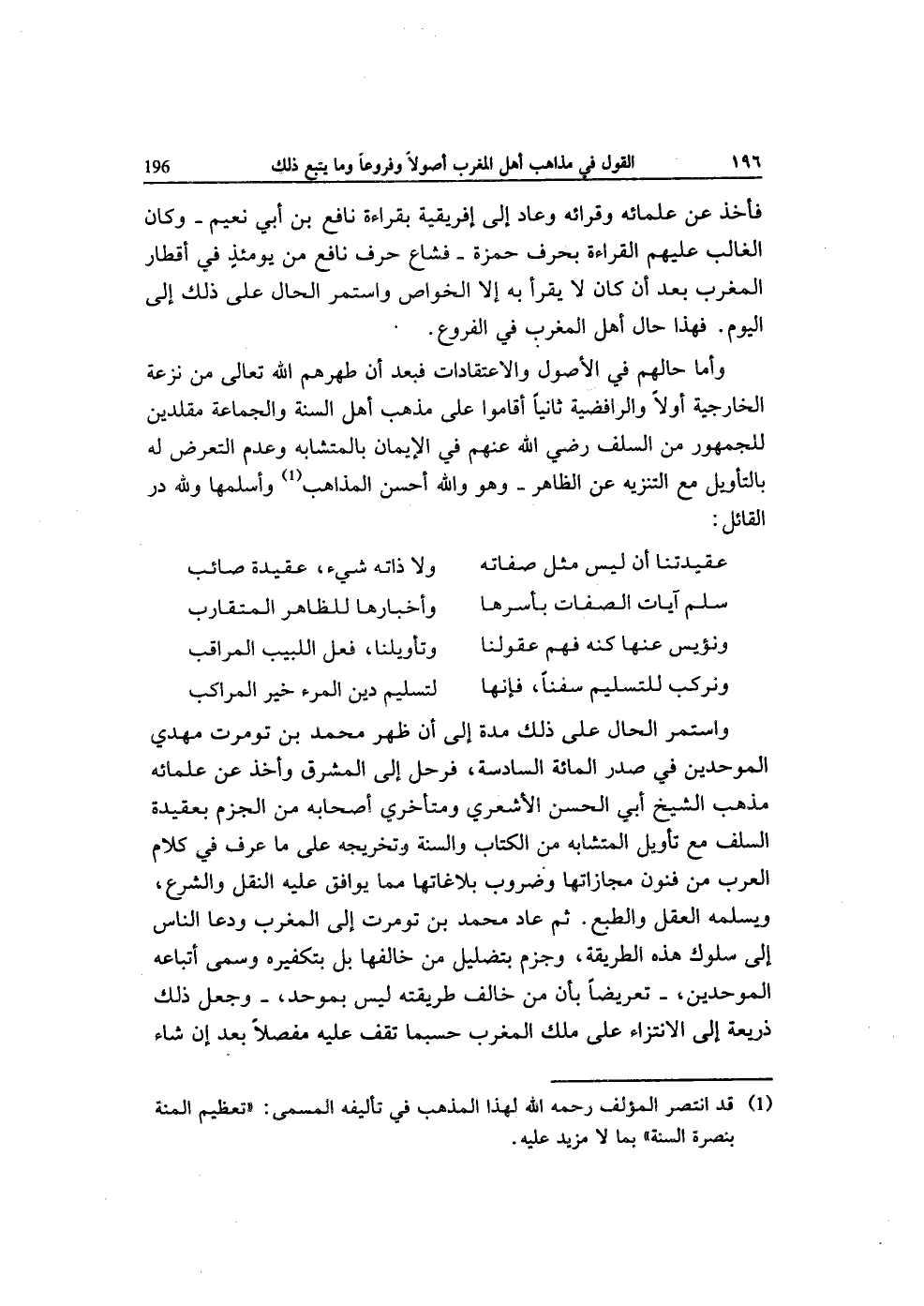 وَاسْتمرّ الْحَال على ذَلِك مُدَّة إِلَى أَن ظهر مُحَمَّد بن تومرت مهْدي الْمُوَحِّدين فِي صدر الْمِائَة السَّادِسَة فَرَحل إِلَى الْمشرق وَأخذ عَن علمائه مَذْهَب الشَّيْخ أبي الْحسن الْأَشْعَرِيّ ومتأخري أَصْحَابه من الْجَزْم بعقيدة السّلف مَعَ تَأْوِيل الْمُتَشَابه من الْكتاب وَالسّنة وتخريجه على مَا عرف فِي كَلَام الْعَرَب من فنون مجازاتها وضروب بلاغاتها مِمَّا يُوَافق عَلَيْهِ النَّقْل وَالشَّرْع ويسلمه الْعقل والطبع ثمَّ عَاد مُحَمَّد بن تومرت إِلَى الْمغرب ودعا النَّاس إِلَى سلوك هَذِه الطَّرِيقَة وَجزم بتضليل من خالفها بل بتكفيره وسمى أَتْبَاعه الْمُوَحِّدين تعريضا بِأَن من خَالف طَرِيقَته لَيْسَ بموحد وَجعل ذَلِك ذَرِيعَة إِلَى الإنتزاء على ملك الْمغرب حَسْبَمَا تقف عَلَيْهِ مفصلا بعد إِن شَاءَ