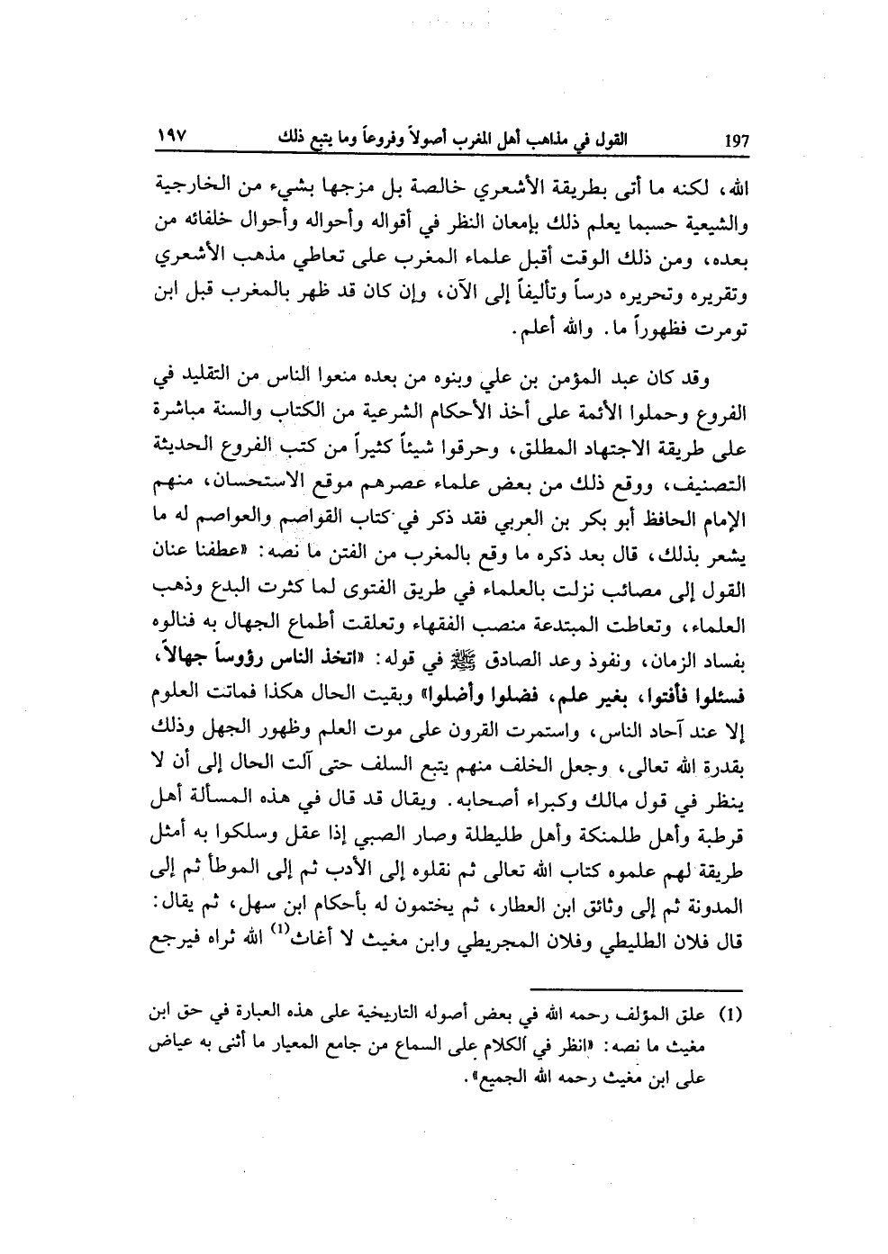 الله لكنه مَا أَتَى بطريقة الْأَشْعَرِيّ خَالِصَة بل مزجها بِشَيْء من الخارجية والشيعية حَسْبَمَا يعلم ذَلِك بإمعان النّظر فِي أَقْوَاله وأحواله وأحوال خلفائه من بعده وَمن ذَلِك الْوَقْت أقبل عُلَمَاء الْمغرب على تعَاطِي مَذْهَب الْأَشْعَرِيّ وَتَقْرِيره وتحريره درسا وتأليفا إِلَى آلان وَإِن كَانَ قد ظهر بالمغرب قبل ابْن تومرت فظهورا مَا وَالله أعلم