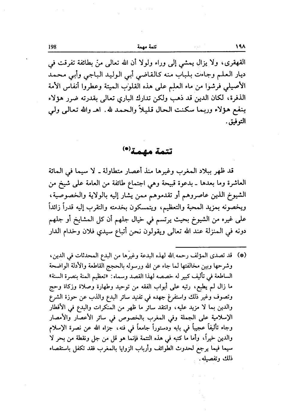 الْقَهْقَرَى وَلَا يزَال يمشي إِلَى وَرَاء وَلَوْلَا أَن الله تَعَالَى من بطَائفَة تَفَرَّقت فِي ديار الْعلم وَجَاءَت بلباب مِنْهُ كَالْقَاضِي أبي الْوَلِيد الْبَاجِيّ وَأبي مُحَمَّد الْأصيلِيّ فرشوا من مَاء الْعلم على هَذِه الْقُلُوب الْميتَة وعطروا أنفاس الْأمة الذفرة لَكَانَ الدّين قد ذهب وَلَكِن تدارك الْبَارِي تَعَالَى بقدرته ضَرَر هَؤُلَاءِ ينفع هَؤُلَاءِ وَرُبمَا سكنت الْحَال قَلِيلا وَالْحَمْد لله اه وَالله تَعَالَى ولي التَّوْفِيق