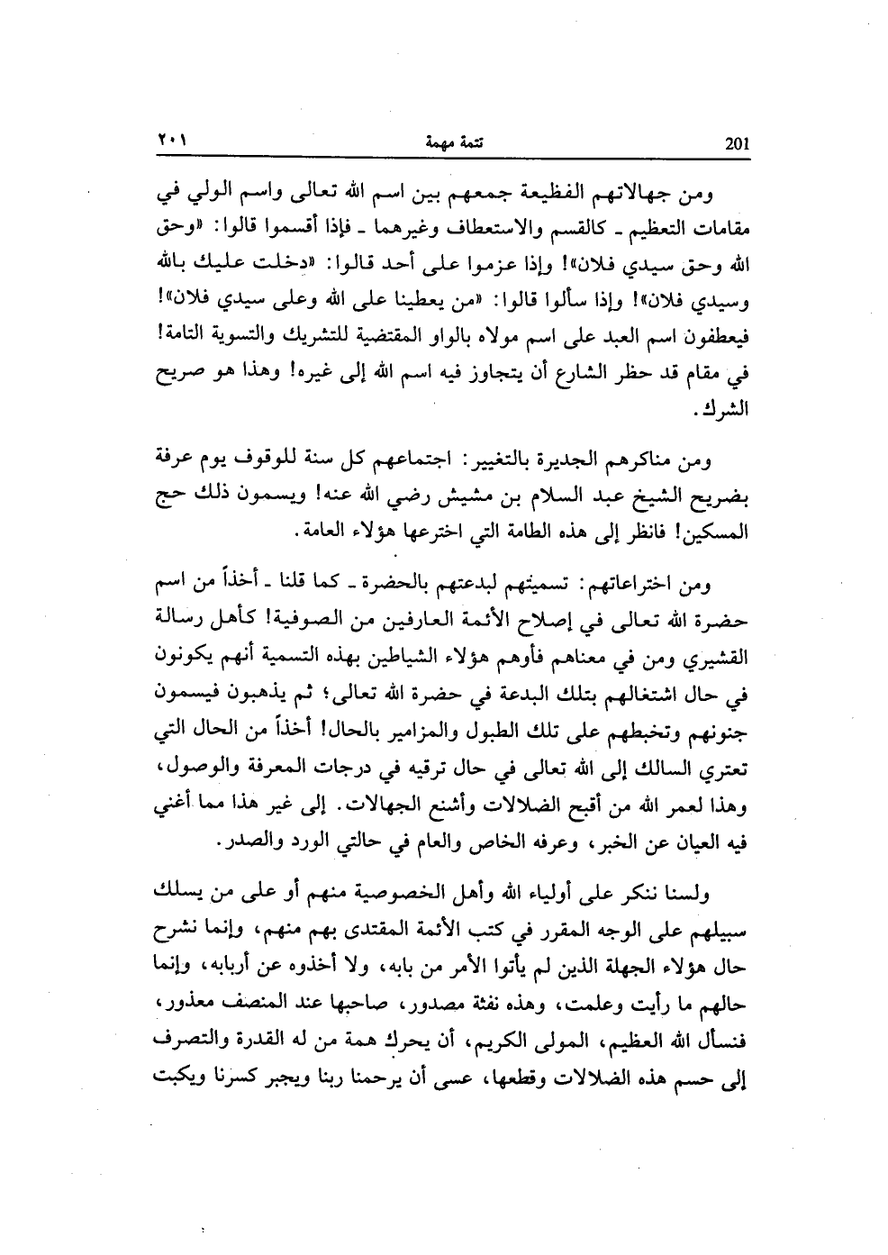 ولسنا ننكر على أَوْلِيَاء الله وَأهل الخصوصية مِنْهُم أَو على من يسْلك سبيلهم على الْوَجْه الْمُقَرّر فِي كتب الْأَئِمَّة المقتدى بهم مِنْهُم وَإِنَّمَا نشرح حَال هَؤُلَاءِ الجهلة الَّذين لم يَأْتُوا الْأَمر من بَابه وَلَا أَخَذُوهُ عَن أربابه وَإِنَّمَا حَالهم مَا رَأَيْت وَعلمت وَهَذِه نفثة مصدور صَاحبهَا عِنْد الْمنصف مَعْذُور فنسأل الله الْعَظِيم الْمولى الْكَرِيم أَن يُحَرك همة من لَهُ الْقُدْرَة وَالتَّصَرُّف إِلَى حسم هَذِه الضلالات وقطعها عَسى أَن يَرْحَمنَا رَبنَا وَيجْبر كسرنا ويكبت