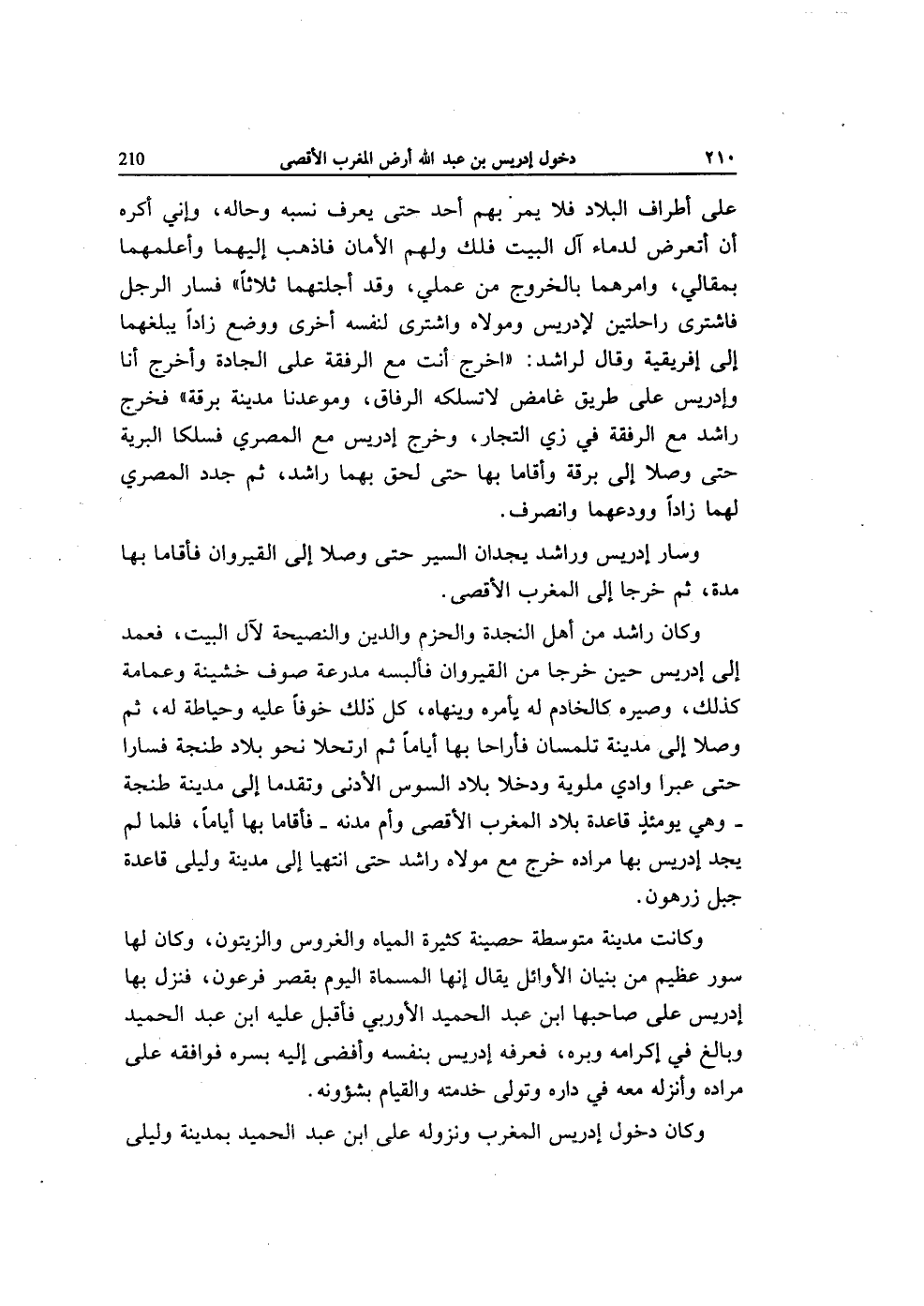 وَكَانَ رَاشد من أهل النجدة والحزم وَالدّين والنصيحة لآل الْبَيْت فَعمد إِلَى إِدْرِيس حِين خرجا من القيروان فألبسه مدرعة صوف خشينة وعمامة كَذَلِك وصيره كالخادم لَهُ يَأْمُرهُ وينهاه كل ذَلِك خوفًا عَلَيْهِ وحياطة لَهُ ثمَّ وصلا إِلَى مَدِينَة تلمسان فأراحا بهَا أَيَّامًا ثمَّ ارتحلا نَحْو بِلَاد طنجة فسارا حَتَّى عبرا وَادي ملوية ودخلا بِلَاد السوس الْأَدْنَى وتقدما إِلَى مَدِينَة طنجة وَهِي يَوْمئِذٍ قَاعِدَة بِلَاد الْمغرب الْأَقْصَى وَأم مدنه فأقاما بهَا أَيَّامًا فَلَمَّا لم يجد إِدْرِيس بهَا مُرَاده خرج مَعَ مَوْلَاهُ رَاشد حَتَّى انتهيا إِلَى مَدِينَة وليلى قَاعِدَة جبل زرهون
