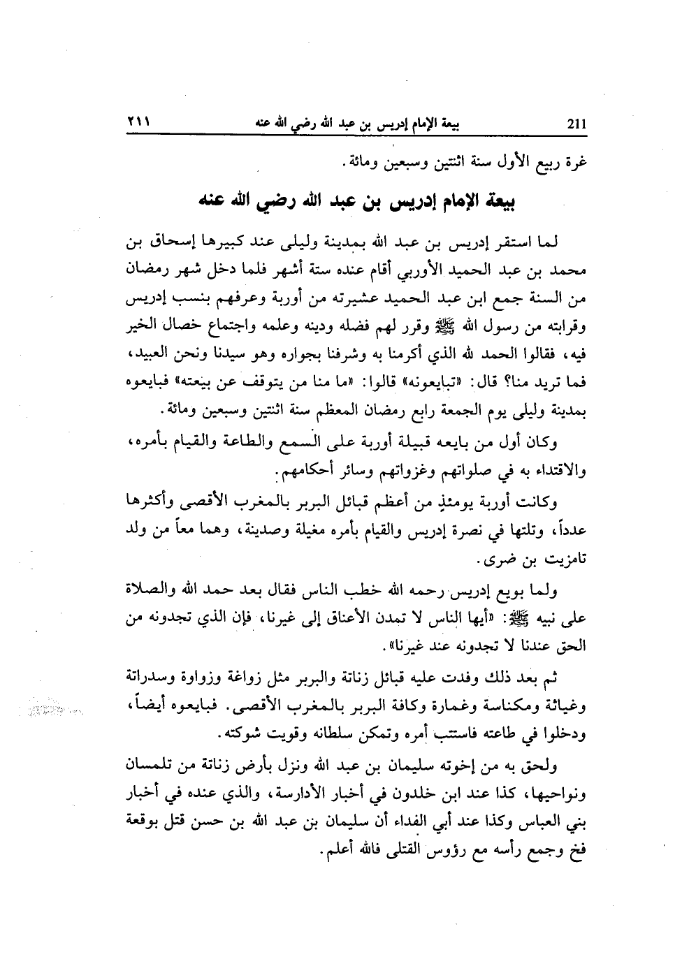وَلما بُويِعَ إِدْرِيس رَحمَه الله خطب النَّاس فَقَالَ بعد حمد الله وَالصَّلَاة على نبيه صلى الله عَلَيْهِ وَسلم أَيهَا النَّاس لَا تَمُدَّن الْأَعْنَاق إِلَى غَيرنَا فَإِن الَّذِي تجدونه من الْحق عندنَا لَا تجدونه عِنْد غَيرنَا