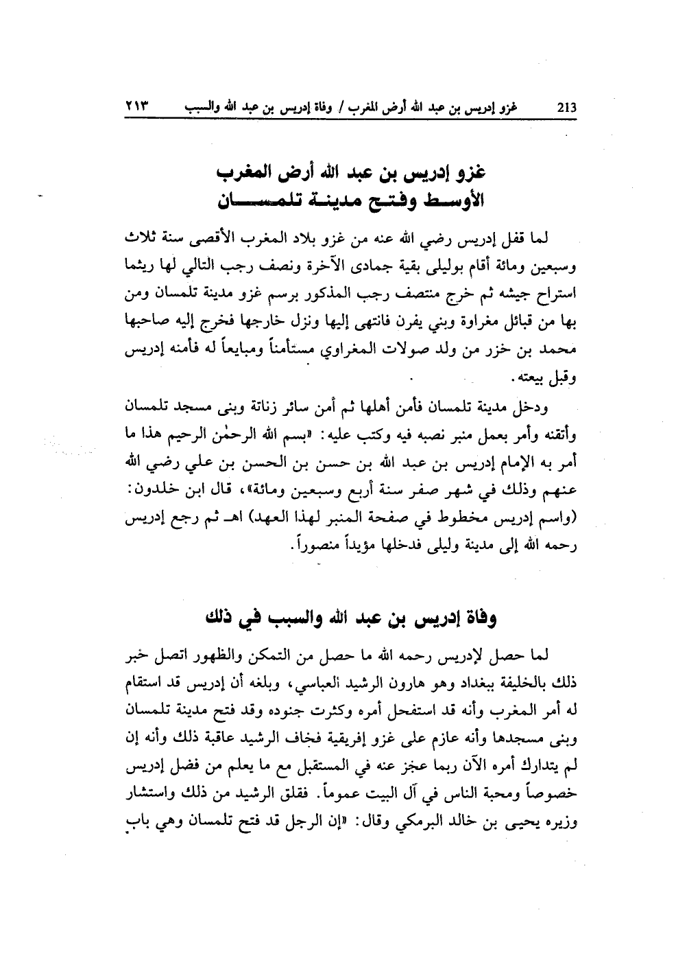 وَدخل مَدِينَة تلمسان فأمن أَهلهَا ثمَّ أَمن سَائِر زناتة وَبنى مَسْجِد تلمسان وأتقنه وَأمر بِعَمَل مِنْبَر نَصبه فِيهِ وَكتب عَلَيْهِ بِسم الله الرَّحْمَن الرَّحِيم هَذَا مَا أَمر بِهِ الإِمَام إِدْرِيس بن عبد الله بن حسن بن الْحسن بن عَليّ رَضِي الله عَنْهُم وَذَلِكَ فِي شهر صفر سنة أَربع وَسبعين وَمِائَة قَالَ ابْن خلدون وَاسم إِدْرِيس مخطوط فِي صفحة الْمِنْبَر لهَذَا الْعَهْد اه ثمَّ رَجَعَ إِدْرِيس رَحمَه الله إِلَى مَدِينَة وليلى فَدَخلَهَا مؤيدا منصورا