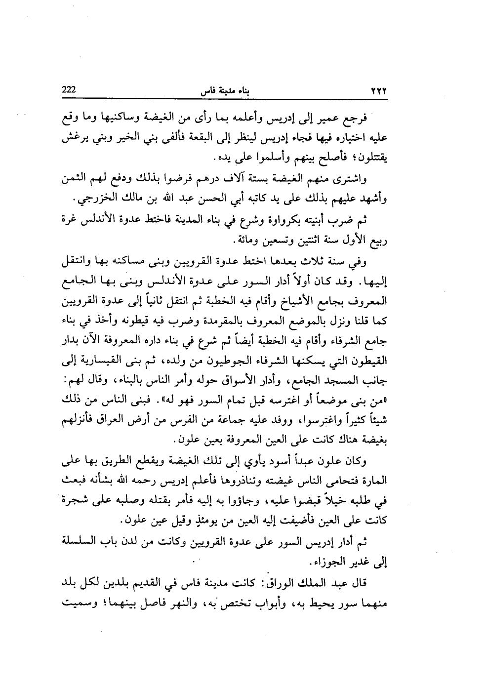 وَفِي سنة ثَلَاث بعْدهَا اختط عدوة الْقرَوِيين وَبنى مساكنه بهَا وانتقل إِلَيْهَا وَقد كَانَ أَولا أدَار السُّور على عدوة الأندلس وَبنى بهَا الْجَامِع الْمَعْرُوف بِجَامِع الْأَشْيَاخ وَأقَام فِيهِ الْخطْبَة ثمَّ انْتقل ثَانِيًا إِلَى عدوة الْقرَوِيين كَمَا قُلْنَا وَنزل بالموضع الْمَعْرُوف بالمقرمدة وَضرب فِيهِ قيطونة وَأخذ فِي بِنَاء جَامع الشرفاء وَأقَام فِيهِ الْخطْبَة أَيْضا ثمَّ شرع فِي بِنَاء دَاره الْمَعْرُوفَة الْآن بدار القيطون الَّتِي يسكنهَا الشرفاء الجوطيون من وَلَده ثمَّ بنى القيسارية إِلَى جَانب الْمَسْجِد الْجَامِع وأدار الْأَسْوَاق حوله وَأمر النَّاس بِالْبِنَاءِ وَقَالَ لَهُم من بنى موضعا أَو اغترسه قبل تَمام السُّور فَهُوَ لَهُ فَبنى النَّاس من ذَلِك شَيْئا كثيرا واغترسوا ووفد عَلَيْهِ جمَاعَة من الْفرس من أَرض الْعرَاق فأنزلهم بغيضة هُنَاكَ كَانَت على الْعين الْمَعْرُوفَة بِعَين علون