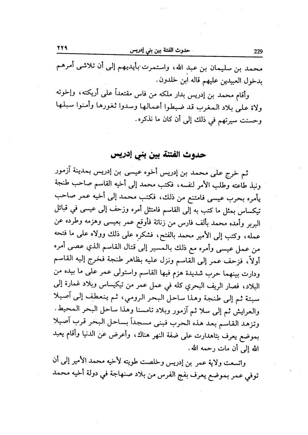ثمَّ خرج على مُحَمَّد بن إِدْرِيس أَخُوهُ عِيسَى بِمَدِينَة آزمور ونبذ طَاعَته وَطلب الْأَمر لنَفسِهِ فَكتب مُحَمَّد إِلَى أَخِيه الْقَاسِم صَاحب طنجة يَأْمُرهُ بِحَرب عِيسَى فَامْتنعَ من ذَلِك فَكتب مُحَمَّد إِلَى أَخِيه عمر صَاحب تيكساس بِمثل مَا كتب بِهِ إِلَى الْقَاسِم فامتثل أمره وزحف إِلَى عِيسَى فِي قبائل البربر وأمده مُحَمَّد بِأَلف فَارس من زناتة فأوقع عمر بِعِيسَى وهزمه وطرده عَن عمله وَكتب إِلَى الْأَمِير مُحَمَّد بِالْفَتْح فشكره على ذَلِك وولاه على مَا فَتحه من عمل عِيسَى وَأمره مَعَ ذَلِك بِالْمَسِيرِ إِلَى قتال الْقَاسِم الَّذِي عصى أمره أَولا فزحف عمر إِلَى الْقَاسِم وَنزل عَلَيْهِ بِظَاهِر طنجة فَخرج إِلَيْهِ الْقَاسِم ودارت بَينهمَا حَرْب شَدِيدَة هزم فِيهَا الْقَاسِم وَاسْتولى عمر على مَا بِيَدِهِ من الْبِلَاد فَصَارَ الرِّيف البحري كُله فِي عمل عمر من تيكيساس وبلاد غمارة إِلَى سبتة ثمَّ إِلَى طنجة وَهَذَا سَاحل الْبَحْر الرُّومِي ثمَّ يَنْعَطِف إِلَى آصيلا والعرايش ثمَّ إِلَى سلا ثمَّ آزمور وبلاد تامسنا وَهَذَا سَاحل الْبَحْر الْمُحِيط وتزهد الْقَاسِم بعد هَذِه الْحَرْب فَبنى مَسْجِدا بساحل الْبَحْر قرب آصيلا بِموضع يعرف بتاهدرات على ضفة النَّهر هُنَاكَ وَأعْرض عَن الدُّنْيَا وَأقَام يعبد الله إِلَى أَن مَاتَ رَحمَه الله