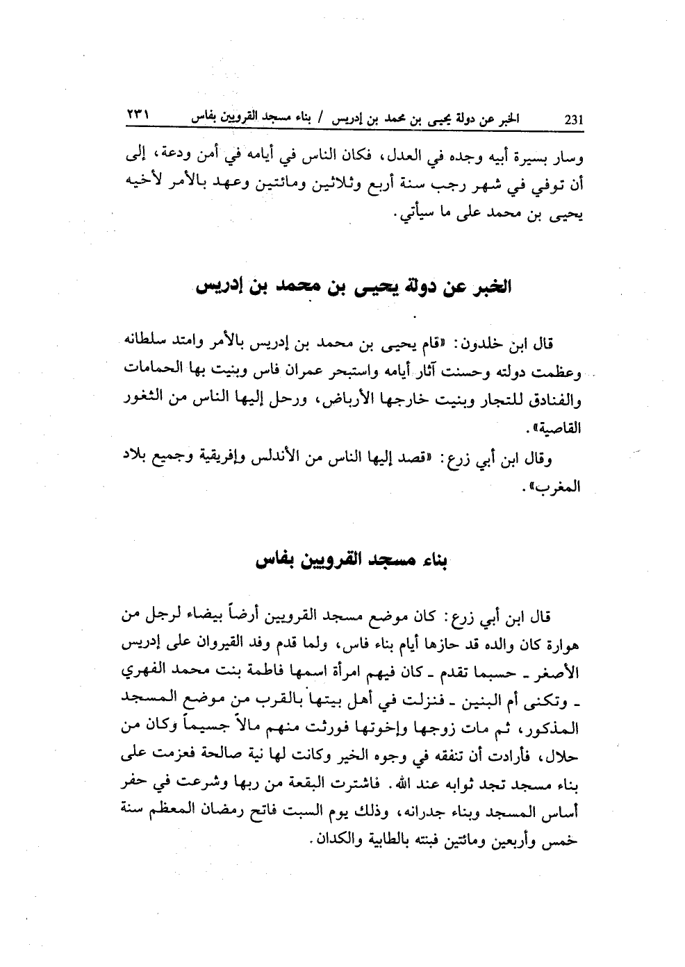 قَالَ ابْن خلدون قَامَ يحيى بن مُحَمَّد بن إِدْرِيس بِالْأَمر وامتد سُلْطَانه وعظمت دولته وَحسنت آثَار أَيَّامه واستبحر عمرَان فاس وبنيت بهَا الحمامات والفنادق للتجار وبنيت خَارِجهَا الأرباض ورحل إِلَيْهَا النَّاس من الثغور القاصية