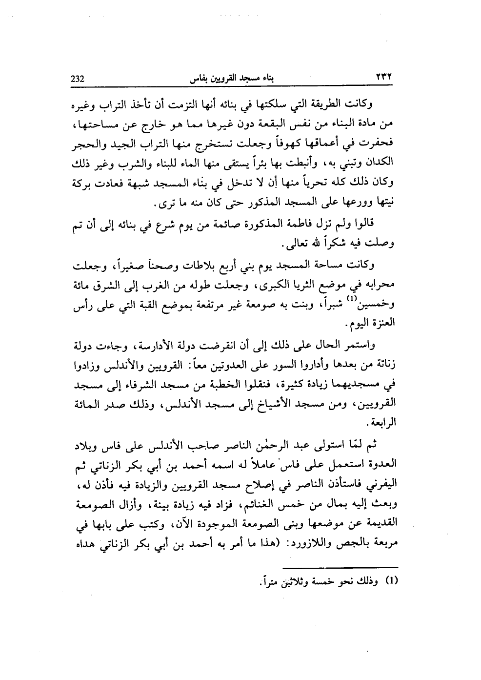 ثمَّ لما استولى عبد الرَّحْمَن النَّاصِر صَاحب الأندلس على فاس وبلاد العدوة اسْتعْمل على فاس عَاملا لَهُ اسْمه أَحْمد بن أبي بكر الزناتي ثمَّ اليفرني فَاسْتَأْذن النَّاصِر فِي إصْلَاح مَسْجِد الْقرَوِيين وَالزِّيَادَة فِيهِ فَأذن لَهُ وَبعث إِلَيْهِ بِمَال من خمس الْغَنَائِم فَزَاد فِيهِ زِيَادَة بَيِّنَة وأزال الصومعة الْقَدِيمَة عَن موضعهَا وَبنى الصومعة الْمَوْجُودَة الْآن وَكتب على بَابهَا فِي مربعة بالجص واللازورد هَذَا مَا أَمر بِهِ أَحْمد بن أبي بكر الزناتي هداه