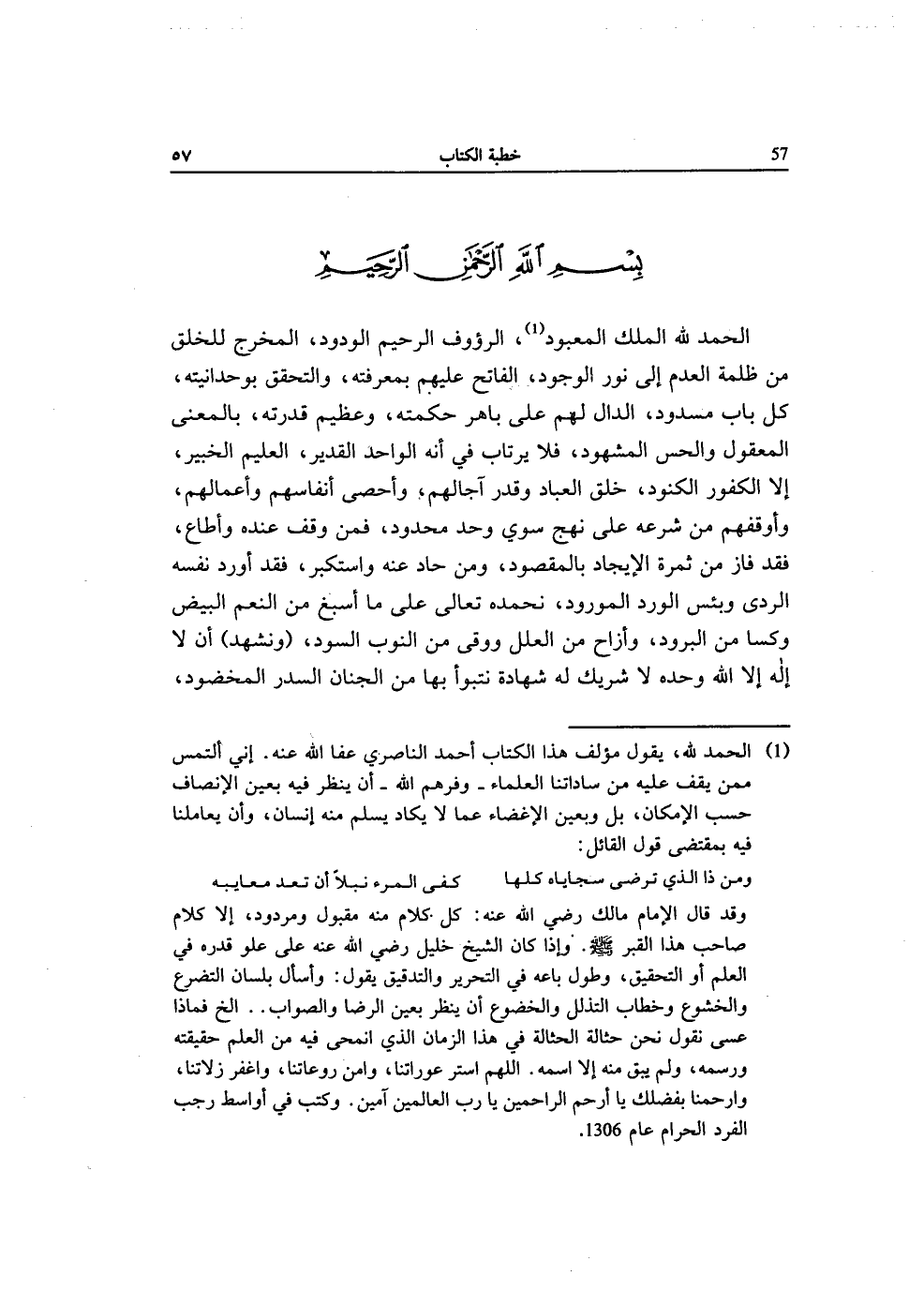الْحَمد لله الْملك المعبود الرؤوف الرَّحِيم الْوَدُود الْمخْرج لِلْخلقِ من ظلمَة الْعَدَم إِلَى نور الْوُجُود الفاتح عَلَيْهِم بمعرفته والتحقق بوحدانيته كل بَاب مسدود الدَّال لَهُم على باهر حكمته وعظيم قدرته بِالْمَعْنَى الْمَعْقُول والحس الْمَشْهُود فَلَا يرتاب فِي أَنه الْوَاحِد الْقَدِير الْعَلِيم الْخَبِير إِلَّا الكفور الكنود خلق الْعباد وَقدر آجالهم وأحصى أنفاسهم وأمالهم وأوقفهم من شَرعه على نهج سوي وحد مَحْدُود فَمن وقف عِنْده وأطاع فقد فَازَ من ثَمَرَة الإيجاد بِالْمَقْصُودِ وَمن حاد عَنهُ واستكبر فقد أورد نَفسه الردى وَبئسَ الْورْد المورود نحمده تَعَالَى على مَا أَسْبغ من النعم الْبيض وكسا من البرود وأزاح من الْعِلَل وَوقى من النوب السود ونشهد أَن لَا إِلَه إِلَّا الله وَحده لَا شريك لَهُ شَهَادَة نتبوأ بهَا من الْجنان السدر المخضود