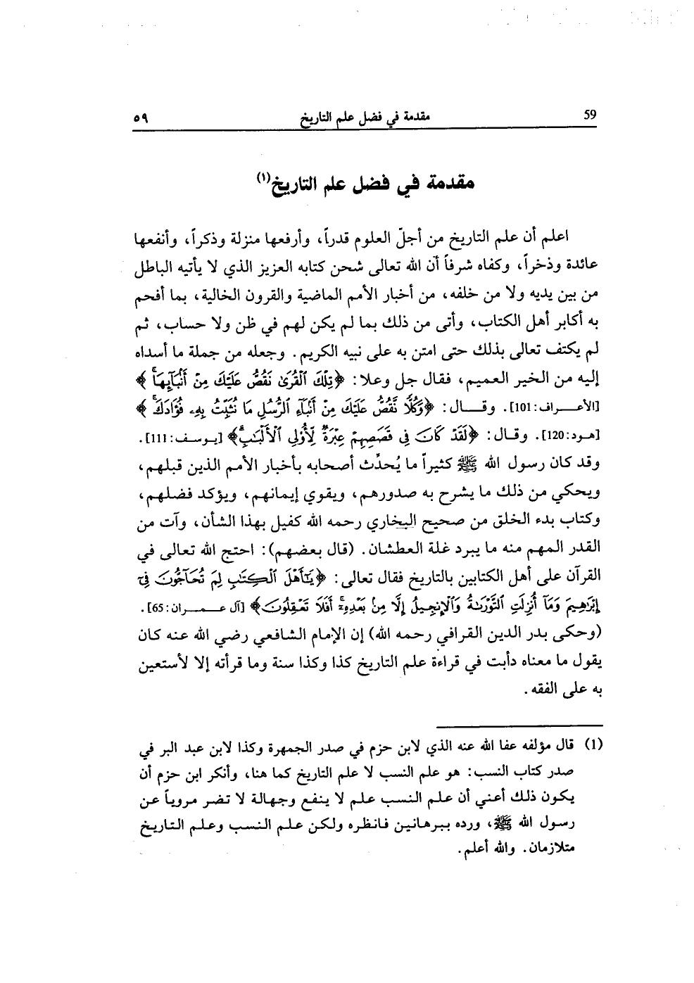 اعْلَم أَن علم التَّارِيخ من أجل الْعُلُوم قدرا وأرفعها منزلَة وذكرا وأنفعها عَائِدَة وذخرا وَكَفاهُ شرفا أَن الله تَعَالَى شحن كِتَابه الْعَزِيز الَّذِي لَا يَأْتِيهِ الْبَاطِل من بَين يَدَيْهِ وَلَا من خَلفه من أَخْبَار الْأُمَم الْمَاضِيَة والقرون الخالية بِمَا أفحم بِهِ أكَابِر أهل الْكتاب وأتى من ذَلِك بِمَا لم يكن لَهُم فِي ظن وَلَا حِسَاب ثمَّ لم يكتف تَعَالَى بذلك حَتَّى امتن بِهِ على نبيه الْكَرِيم وَجعله من جملَة مَا أسداه إِلَيْهِ من الْخَيْر العميم فَقَالَ جلّ وَعلا {تِلْكَ الْقرى نقص عَلَيْك من أنبائها} وَقَالَ {وكلا نقص عَلَيْك من أنباء الرُّسُل مَا نثبت بِهِ فُؤَادك} وَقَالَ {لقد كَانَ فِي قصصهم عِبْرَة لأولي الْأَلْبَاب} وَقد كَانَ رَسُول الله صلى الله عَلَيْهِ وَسلم كثيرا مَا يحدث أَصْحَابه بأخبار الْأُمَم الَّذين قبلهم ويحكي من ذَلِك مَا يشْرَح بِهِ صُدُورهمْ وَيُقَوِّي إيماناهم ويؤكد فَضلهمْ وَكتاب بَدْء الْخلق من صَحِيح البُخَارِيّ رَحمَه الله كَفِيل بِهَذَا الشَّأْن وَآت من الْقدر المهم مِنْهُ مَا يبرد غلَّة العطشان قَالَ بَعضهم احْتج الله تَعَالَى فِي الْقُرْآن على أهل الْكِتَابَيْنِ بالتاريخ فَقَالَ تَعَالَى {يَا أهل الْكتاب لم تحاجون فِي إِبْرَاهِيم وَمَا أنزلت التَّوْرَاة وَالْإِنْجِيل إِلَّا من بعده أَفلا تعقلون} وَحكى بدر الدّين الْقَرَافِيّ رَحمَه الله إِن الإِمَام الشَّافِعِي رَضِي الله عَنهُ كَانَ يَقُول مَا مَعْنَاهُ دأبت فِي قِرَاءَة علم التَّارِيخ كَذَا وَكَذَا سنة وَمَا قرأته إِلَّا لأستعين بِهِ على الْفِقْه