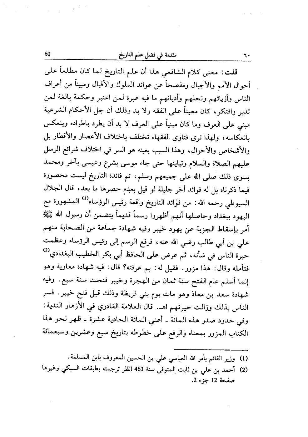 قلت معنى كَلَام الشَّافِعِي هَذَا أَن علم التَّارِيخ لما كَانَ مطلعا على أَحْوَال الْأُمَم والأجيال ومفصحا عَن عوائد الْمُلُوك والأقيال ومبينا من أعراف النَّاس وأزيائهم ونحلهم وأديانهم مَا فِيهِ عِبْرَة لمن اعْتبر وَحِكْمَة بَالِغَة لمن تدبر وافتكر كَانَ معينا على الْفِقْه وَلَا بُد وَذَلِكَ أَن جلّ الْأَحْكَام الشَّرْعِيَّة مَبْنِيّ على الْعرف وَمَا كَانَ مَبْنِيا على الْعرف لَا بُد أَن يطرد باطراده وينعكس بانعكاسه وَلِهَذَا ترى فتاوي الْفُقَهَاء تخْتَلف باخْتلَاف الْأَعْصَار والأقطار بل والأشخاص وَالْأَحْوَال وَهَذَا السَّبَب بِعَيْنِه هُوَ السِّرّ فِي اخْتِلَاف شرائع الرُّسُل عَلَيْهِم الصَّلَاة وَالسَّلَام وتباينها حَتَّى جَاءَ مُوسَى بشرع وَعِيسَى بآخر وَمُحَمّد بسوى ذَلِك صلى الله على جَمِيعهم وَسلم تمّ فَائِدَة التَّارِيخ لَيست محصورة فِيمَا ذَكرْنَاهُ بل لَهُ فَوَائِد أخر جليلة لَو قيل بِعَدَمِ حصرها مَا بعد قَالَ الْجلَال السُّيُوطِيّ رَحمَه الله من فَوَائِد التَّارِيخ وَاقعَة رَئِيس الرؤساء الْمَشْهُورَة مَعَ الْيَهُود بِبَغْدَاد وحاصلها أَنهم أظهرُوا رسما قَدِيما يتَضَمَّن أَن رَسُول الله صلى الله عَلَيْهِ وَسلم أَمر بِإِسْقَاط الْجِزْيَة عَن يهود خَيْبَر وَفِيه شَهَادَة جمَاعَة من الصَّحَابَة مِنْهُم عَليّ بن أبي طَالب رَضِي الله عَنهُ فَرفع الرَّسْم إِلَى رَئِيس الرؤساء وعظمت حيرة النَّاس فِي شَأْنه ثمَّ عرض على الْحَافِظ أبي بكر الْخَطِيب الْبَغْدَادِيّ فَتَأَمّله وَقَالَ هَذَا مزور فَقيل لَهُ بِمَ عَرفته قَالَ فِيهِ شَهَادَة مُعَاوِيَة وَهُوَ إِنَّمَا أسلم عَام الْفَتْح سنة ثَمَان من الْهِجْرَة وخيبر فتحت سنة سبع وَفِيه شَهَادَة سعد بن معَاذ وَهُوَ مَاتَ يَوْم بني قُرَيْظَة وَذَلِكَ قبل فتح خَيْبَر فسر النَّاس بذلك وزالت حيرتهم اه قَالَ الْعَلامَة القادري فِي الأزهار الندية وَفِي حُدُود صدر هَذِه الْمِائَة أَعنِي الْمِائَة الْحَادِيَة عشرَة ظهر نَحْو هَذَا الْكتاب المزور بِمَعْنَاهُ وَالرَّفْع على خطوطه بتاريخ سبع وَعشْرين وَسَبْعمائة
