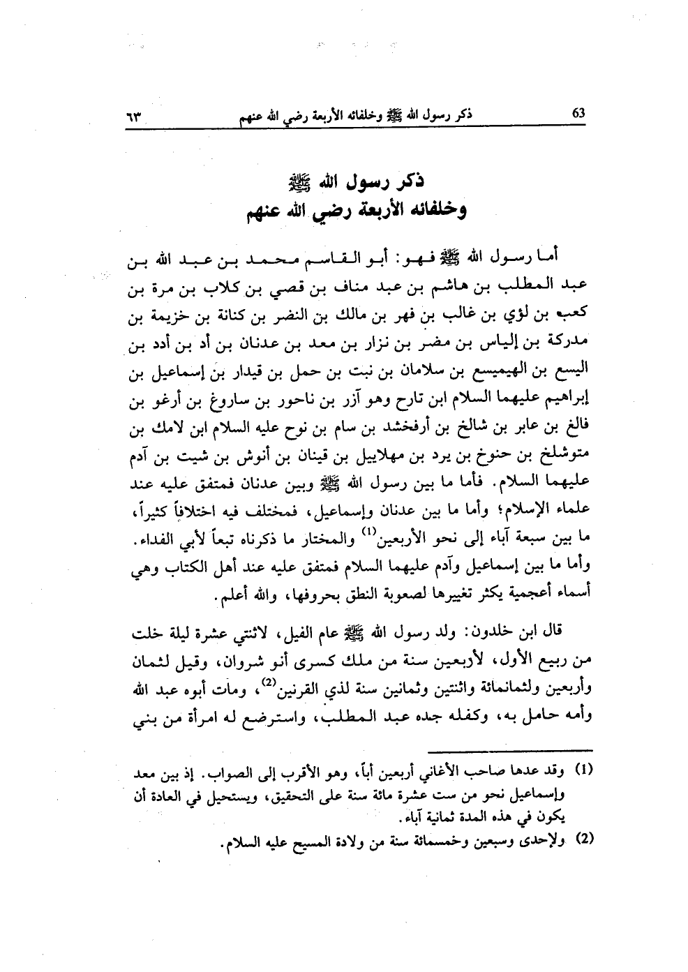 أما رَسُول الله صلى الله عَلَيْهِ وَسلم فَهُوَ أَبُو الْقَاسِم مُحَمَّد بن عبد الله بن عبد الْمطلب بن هَاشم بن عبد منَاف بن قصي بن كلاب بن مرّة بن كَعْب بن لؤَي بن غَالب بن فهر بن مَالك بن النَّضر بن كنَانَة بن خُزَيْمَة بن مدركة بن إلْيَاس بن مُضر بن نزار بن معد بن عدنان بن أد بن أدد بن اليسع بن الهيميسع بن سلامان بن نبت بن حمل بن قيدار بن إِسْمَاعِيل بن إِبْرَاهِيم عَلَيْهِمَا السَّلَام ابْن تارح وَهُوَ آزر بن ناحور بن ساروغ بن أرغو بن فالغ بن عَابِر بن شالخ بن أرفخشد بن سَام بن نوح عَلَيْهِ السَّلَام ابْن لامك بن متوشلخ بن حنوخ بن يرد بن مهلاييل بن قينان بن أنوش بن شيت بن آدم عَلَيْهِمَا السَّلَام فَأَما مَا بَين رَسُول صلى الله عَلَيْهِ وَسلم وَبَين عدنان فمتفق عَلَيْهِ عِنْد عُلَمَاء الْإِسْلَام وَأما مَا بَين عدنان وَإِسْمَاعِيل فمختلف فِيهِ اخْتِلَافا كثيرا مَا بَين سَبْعَة آبَاء إِلَى نَحْو الْأَرْبَعين وَالْمُخْتَار مَا ذَكرْنَاهُ تبعا لأبي الْفِدَاء وَأما مَا بَين إِسْمَاعِيل وآدَم عَلَيْهِمَا السَّلَام فمتفق عَلَيْهِ عِنْد أهل الْكتاب وَهِي أَسمَاء أَعْجَمِيَّة يكثر تغييرها لصعوبة النُّطْق بحروفها وَالله أعلم