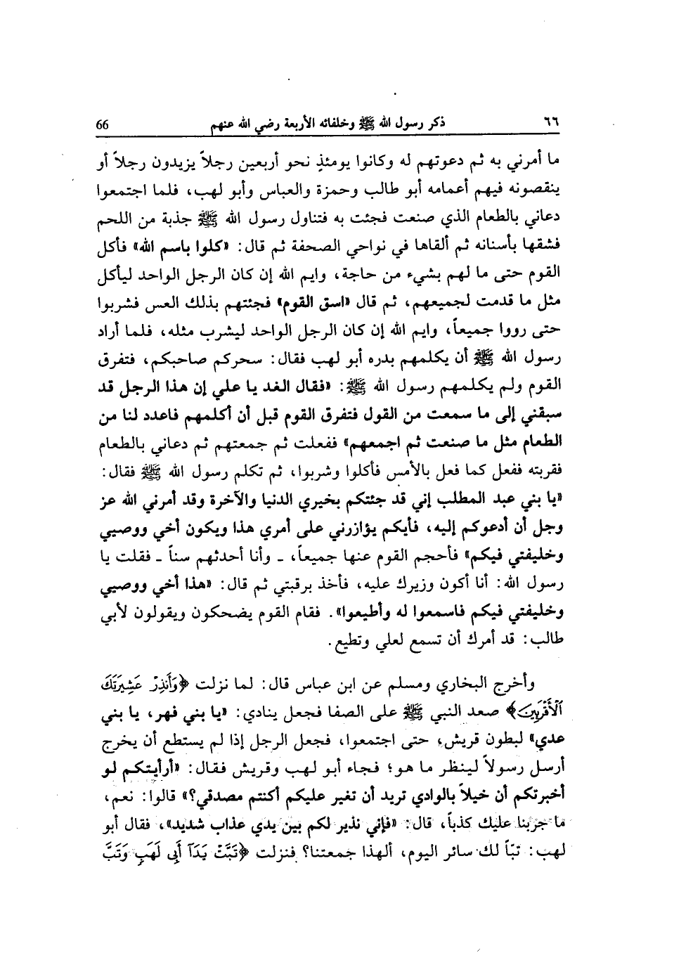 مَا أَمرنِي بِهِ ثمَّ دعوتهم لَهُ وَكَانُوا يَوْمئِذٍ نَحْو أَرْبَعِينَ رجلا يزِيدُونَ رجلا أَو ينقصونه فيهم أَعْمَامه أَبُو طَالب وَحَمْزَة وَالْعَبَّاس وَأَبُو لَهب فَلَمَّا اجْتَمعُوا دَعَاني بِالطَّعَامِ الَّذِي صنعت فَجئْت بِهِ فَتَنَاول رَسُول الله صلى الله عَلَيْهِ وَسلم جذبه من اللَّحْم فَشَقهَا بِأَسْنَانِهِ ثمَّ أَلْقَاهَا فِي نواحي الصحفة ثمَّ قَالَ (كلوا باسم الله) فَأكل الْقَوْم حَتَّى مَا لَهُم بِشَيْء من حَاجَة وَايْم الله إِن كَانَ الرجل الْوَاحِد ليَأْكُل مثل مَا قدمت لجميعهم ثمَّ قَالَ (اسْقِ الْقَوْم) فجئتهم بذلك الْعس فَشَرِبُوا حَتَّى رووا جَمِيعًا وَايْم الله إِن كَانَ الرجل الْوَاحِد ليشْرب مثله فَلَمَّا أَرَادَ رَسُول الله صلى الله عَلَيْهِ وَسلم أَن يكلمهم بدره أَبُو لَهب فَقَالَ سحركم صَاحبكُم فَتفرق الْقَوْم وَلم يكلمهم رَسُول الله صلى الله عَلَيْهِ وَسلم (فَقَالَ الْغَد يَا عَليّ إِن هَذَا الرجل قد سبقني إِلَى مَا سَمِعت من القَوْل فَتفرق الْقَوْم قبل أَن أكلمهم فاعدد لنا من الطَّعَام مثل مَا صنعت ثمَّ أجمعهم) فَفعلت ثمَّ جمعتهم ثمَّ دَعَاني بِالطَّعَامِ فقربته فَفعل كَمَا فعل بالْأَمْس فَأَكَلُوا وَشَرِبُوا ثمَّ تكلم رَسُول الله صلى الله عَلَيْهِ وَسلم فَقَالَ (يَا بني عبد الْمطلب إِنِّي قد جِئتُكُمْ بخيري الدُّنْيَا وَالْآخِرَة وَقد أَمرنِي الله عز وَجل أَن أدعوكم إِلَيْهِ فَأَيكُمْ يؤازرني على أَمْرِي هَذَا وَيكون أخي ووصيي وخليفتي فِيكُم) فأحجم الْقَوْم عَنْهَا جَمِيعًا وَأَنا أحدثهم سنا فَقلت يَا رَسُول الله أَنا أكون وزيرك عَلَيْهِ فَأخذ برقبتي ثمَّ قَالَ (هَذَا أخي ووصيي وخليفتي فِيكُم فا سمعُوا لَهُ وَأَطيعُوا) فَقَامَ الْقَوْم يَضْحَكُونَ وَيَقُولُونَ لأبي طَالب قد أَمرك أَن تسمع لعَلي وتطيع