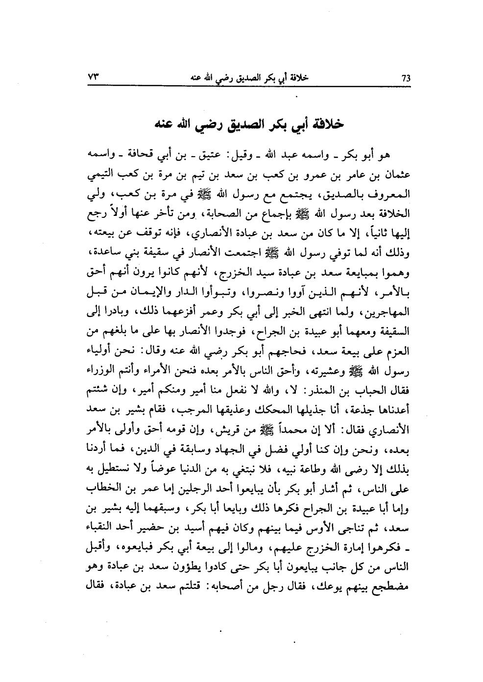 هُوَ أَبُو بكر واسْمه عبد الله وَقيل عَتيق بن أبي قُحَافَة واسْمه عُثْمَان بن عَامر بن عَمْرو بن كَعْب بن سعد بن تيم بن مرّة بن كَعْب التَّيْمِيّ الْمَعْرُوف بِالصديقِ يجْتَمع مَعَ رَسُول الله صلى الله عَلَيْهِ وَسلم فِي مرّة بن كَعْب ولي الْخلَافَة بعد رَسُول الله صلى الله عَلَيْهِ وَسلم بِإِجْمَاع من الصَّحَابَة وَمن تَأَخّر عَنْهَا أَولا رَجَعَ إِلَيْهَا ثَانِيًا إِلَّا مَا كَانَ من سعد بن عبَادَة الْأنْصَارِيّ فَإِنَّهُ توقف عَن بيعَته وَذَلِكَ أَنه لما توفّي رَسُول الله صلى الله عَلَيْهِ وَسلم اجْتمعت الْأَنْصَار فِي سَقِيفَة بني سَاعِدَة وهموا بمبايعة سعد بن عبَادَة سيد الْخَزْرَج لأَنهم كَانُوا يرَوْنَ أَنهم أَحَق بِالْأَمر لأَنهم الَّذين آووا ونصروا وتبوأوا الدَّار وَالْإِيمَان من قبل الْمُهَاجِرين وَلما انْتهى الْخَبَر إِلَى أبي بكر وَعمر أفزعهما ذَلِك وبادرا إِلَى السَّقِيفَة ومعهما أَبُو عُبَيْدَة بن الْجراح فوجدوا الْأَنْصَار بهَا على مَا بَلغهُمْ من الْعَزْم على بيعَة سعد فحاجهم أَبُو بكر رَضِي الله عَنهُ وَقَالَ نَحن أَوْلِيَاء رَسُول الله صلى الله عَلَيْهِ وَسلم وعشيرته وأحق النَّاس بِالْأَمر بعده فَنحْن الْأُمَرَاء وَأَنْتُم الوزراء فَقَالَ الْحباب بن الْمُنْذر لَا وَالله لَا نَفْعل منا أَمِير ومنكم أَمِير وَإِن شِئْتُم أعدناها جَذَعَة أَنا جذيلها المحكك وعذيقها المرجب فَقَامَ بشير بن سعد الْأنْصَارِيّ فَقَالَ أَلا إِن مُحَمَّدًا صلى الله عَلَيْهِ وَسلم من قُرَيْش وَإِن قومه أَحَق وَأولى بِالْأَمر بعده وَنحن وَإِن كُنَّا أولي فضل فِي الْجِهَاد وسابقة فِي الدّين فَمَا أردنَا بذلك إِلَّا رضى الله وَطَاعَة نبيه فَلَا نبتغي بِهِ من الدُّنْيَا عوضا وَلَا نستطيل بِهِ على النَّاس ثمَّ أَشَارَ أَبُو بكر بِأَن يبايعوا أحد الرجلَيْن إِمَّا عمر بن الْخطاب وَإِمَّا أَبَا عُبَيْدَة بن الْجراح فكرها ذَلِك وَبَايِعًا أَبَا بكر وسبقهما إِلَيْهِ بشير بن سعد ثمَّ تناجى الْأَوْس فِيمَا بَينهم وَكَانَ فيهم أسيد بن حضير أحد النُّقَبَاء فكرهوا إِمَارَة الْخَزْرَج عَلَيْهِم ومالوا إِلَى بيعَة أبي بكر فَبَايعُوهُ وَأَقْبل النَّاس من كل جَانب يبايعون أَبَا بكر حَتَّى كَادُوا يطؤون سعد بن عبَادَة وَهُوَ مُضْطَجع بَينهم يوعك فَقَالَ رجل من أَصْحَابه قتلتم سعد بن عبَادَة فَقَالَ