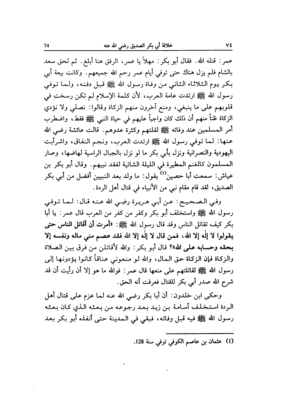 وَفِي الصَّحِيح عَن أبي هُرَيْرَة رَضِي الله عَنهُ قَالَ لما توفّي رَسُول الله صلى الله عَلَيْهِ وَسلم واستخلف ابو بكر وَكفر من كفر من الْعَرَب قَالَ عمر يَا أَبَا بكر كَيفَ تقَاتل النَّاس وَقد قَالَ رَسُول الله صلى الله عَلَيْهِ وَسلم (أمرت أَن أقَاتل النَّاس حَتَّى يَقُولُوا لَا إِلَه إِلَّا الله فَمن قَالَ لَا إِلَه إِلَّا الله فقد عصم مني مَاله وَنَفسه إِلَّا بِحقِّهِ وحسابه على الله) قَالَ أَبُو بكر وَالله لأقاتلن من فرق بَين الصَّلَاة وَالزَّكَاة فَإِن الزَّكَاة حق المَال وَالله لَو مَنَعُونِي عنَاقًا كَانُوا يؤدونها إِلَى رَسُول الله صلى الله عَلَيْهِ وَسلم لقاتلتهم على منعهَا قَالَ عمر فو الله مَا هُوَ إِلَّا أَن رَأَيْت أَن قد شرح الله صدر أبي بكر لِلْقِتَالِ فَعرفت أَنه الْحق