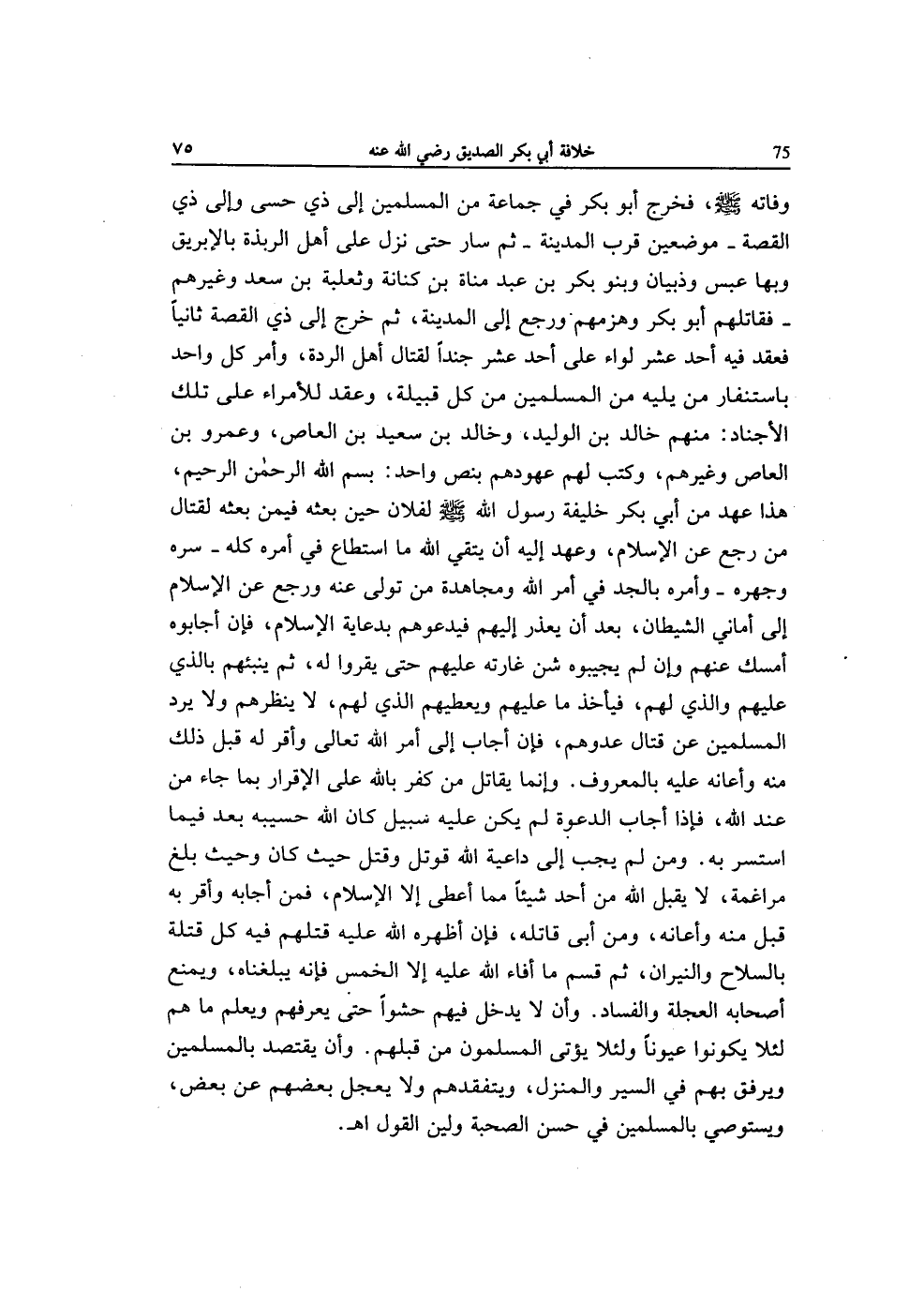 وَفَاته صلى الله عَلَيْهِ وَسلم فَخرج أَبُو بكر فِي جمَاعَة من الْمُسلمين إِلَى ذِي حسي وَإِلَى ذِي الْقِصَّة موضِعين قرب الْمَدِينَة ثمَّ سَار حَتَّى نزل على أهل الربذَة بالإبريق وَبهَا عبس وذبيان وَبَنُو بكر بن عبد مَنَاة بن كنَانَة وثعلبة بن سعد وَغَيرهم فَقَاتلهُمْ أَبُو بكر وَهَزَمَهُمْ وَرجع إِلَى الْمَدِينَة ثمَّ خرج إِلَى ذِي الْقِصَّة ثَانِيًا فعقد فِيهِ أحد عشر لِوَاء على أحد عشر جندا لقِتَال أهل الرِّدَّة وَأمر كل وَاحِد باستنفار من يَلِيهِ من الْمُسلمين من كل قَبيلَة وَعقد لِلْأُمَرَاءِ على تِلْكَ الأجناد مِنْهُم خَالِد بن الْوَلِيد وخَالِد بن سعيد بن الْعَاصِ وَعَمْرو بن الْعَاصِ وَغَيرهم وَكتب لَهُم عهودهم بِنَصّ وَاحِد بِسم الله الرَّحْمَن الرَّحِيم هَذَا عهد من أبي بكر خَليفَة رَسُول الله صلى الله عَلَيْهِ وَسلم لفُلَان حِين بَعثه فِيمَن بَعثه لقِتَال من رَجَعَ عَن الْإِسْلَام وعهد إِلَيْهِ أَن يَتَّقِي الله مَا اسْتَطَاعَ فِي أمره كُله سره وجهره وَأمره بالجد فِي أَمر الله ومجاهدة من تولى عَنهُ وَرجع عَن الْإِسْلَام إِلَى أماني الشَّيْطَان بعد أَن يعْذر إِلَيْهِم فيدعوهم بِدِعَايَةِ الْإِسْلَام فَإِن أجابوه أمسك عَنْهُم وَإِن لم يُجِيبُوهُ شن غارته عَلَيْهِم حَتَّى يقرُّوا لَهُ ثمَّ ينبئهم وَالَّذِي عَلَيْهِم وَلِذِي لَهُم فَيَأْخُذ مَا عَلَيْهِم ويعطيهم الَّذِي لَهُم لَا ينظرهم وَلَا يرد الْمُسلمين عَن قتال عدوهم فَإِن أجَاب إِلَى أَمر الله تَعَالَى وَأقر لَهُ قبل ذَلِك مِنْهُ وأعانه عَلَيْهِ بِالْمَعْرُوفِ وَإِنَّمَا يُقَاتل من كفر بِاللَّه على الْإِقْرَار بِمَا جَاءَ من عِنْد الله فَإِذا أجَاب الدعْوَة لم يكن عَلَيْهِ سَبِيل كَانَ الله حسيبه بعد فِيمَا استسر بِهِ وَمن لم يجب إِلَى دَاعِيَة الله قوتل وَقتل حَيْثُ كَانَ وَحَيْثُ بلغ مراغمة لَا يقبل الله من أحد شَيْئا مِمَّا أعْطى إِلَّا الْإِسْلَام فَمن أَجَابَهُ وَأقر بِهِ قبل مِنْهُ وأعانه وَمن أَبى قَاتله فَإِن أظهره الله عَلَيْهِ قَتلهمْ فِيهِ كل قتلة بِالسِّلَاحِ والنيران ثمَّ قسم مَا أَفَاء الله عَلَيْهِ إِلَّا الْخمس فَإِنَّهُ يبلغناه وَيمْنَع أَصْحَابه العجلة وَالْفساد وَأَن لَا يدْخل فيهم حَشْوًا حَتَّى يعرفهُمْ وَيعلم مَا هم لِئَلَّا يَكُونُوا عيُونا وَلِئَلَّا يُؤْتى الْمُسلمُونَ من قبلهم وَأَن يقتصد بِالْمُسْلِمين ويرفق بهم فِي السّير والمنزل ويتفقدهم وَلَا يعجل بَعضهم عَن بعض ويستوصي بِالْمُسْلِمين فِي حسن الصُّحْبَة ولين القَوْل اه