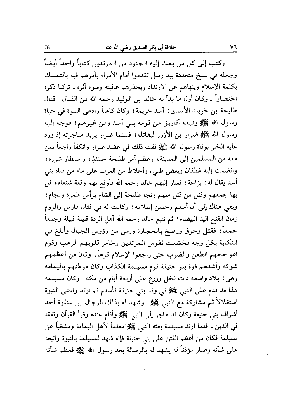 وَكتب إِلَى كل من بعث إِلَيْهِ الْجنُود من الْمُرْتَدين كتابا وَاحِدًا أَيْضا وَجعله فِي نسخ مُتعَدِّدَة بيد رسل تقدمُوا أَمَام الْأُمَرَاء يَأْمُرهُم فِيهِ بالتمسك بِكَلِمَة الْإِسْلَام وينهاهم عَن الارتداد ويحذرهم عاقبته وَسُوء أَثَره تركنَا ذكره اختصارا وَكَانَ أول مَا بَدَأَ بِهِ خَالِد بن الْوَلِيد رَحمَه الله من الْقِتَال قتال طليحة بن خويلد الْأَسدي أَسد خُزَيْمَة وَكَانَ كَاهِنًا وَادّعى النُّبُوَّة فِي حَيَاة رَسُول الله صلى الله عَلَيْهِ وَسلم وَتَبعهُ أفاريق من قومه بني أَسد وَمن غَيرهم فَوجه إِلَيْهِ رَسُول الله صلى الله عَلَيْهِ وَسلم ضرار بن الْأَزْوَر ليقاتله فَبَيْنَمَا ضرار يُرِيد مناجزته إِذْ ورد عَلَيْهِ الْخَبَر بوفاة رَسُول الله صلى الله عَلَيْهِ وَسلم ففت ذَلِك فِي عضد ضرار وانكفأ رَاجعا بِمن مَعَه من الْمُسلمين إِلَى الْمَدِينَة وَعظم أَمر طليحة حِينَئِذٍ واستطار شرره وانضمت إِلَيْهِ غطفان وَبَعض طييء وأخلاط من الْعَرَب على مَاء من مياه بني أَسد يُقَال لَهُ بزاخة فَسَار إِلَيْهِم خَالِد رَحمَه الله فأوقع بهم وقْعَة شنعاء فل بهَا جمعهم وَقتل من قتل مِنْهُم وَنَجَا طليحة إِلَى الشَّام بِرَأْس طمرة ولجام وَبَقِي هُنَاكَ إِلَى أَن أسلم وَحسن إِسْلَامه وَكَانَت لَهُ فِي قتال فَارس وَالروم زمَان الْفَتْح الْيَد الْبَيْضَاء ثمَّ تتبع خَالِد رَحمَه الله أهل الرِّدَّة قَبيلَة قَبيلَة وجمعا جمعا فَقتل وَحرق ورضخ بِالْحِجَارَةِ وَرمى من رُؤُوس الْجبَال وأبلغ فِي النكاية بِكُل وَجه فخشعت نفوس الْمُرْتَدين وخامر قُلُوبهم الرعب وَقوم اعواججهم الطعْن وَالضَّرْب حَتَّى راجعوا الْإِسْلَام كرها وَكَانَ من اعظمهم شَوْكَة وأشدهم قُوَّة بَنو حنيفَة قوم مُسَيْلمَة الْكذَّاب وَكَانَ موطنهم بِالْيَمَامَةِ وَهِي بِلَاد وَاسِعَة ذَات نخل وَزرع على أَرْبَعَة أَيَّام من مَكَّة وَكَانَ مُسَيْلمَة هَذَا قد قدم على النَّبِي صلى الله عَلَيْهِ وَسلم فيوفد بني حنيفَة فَأسلم ثمَّ ارْتَدَّ وَادّعى النُّبُوَّة اسْتِقْلَالا ثمَّ مُشَاركَة مَعَ النَّبِي صلى الله عَلَيْهِ وَسلم وَشهد لَهُ بذلك الرِّجَال بن عنفوة أحد أَشْرَاف بني حنيفَة وَكَانَ قد هَاجر إِلَى النَّبِي صلى الله عَلَيْهِ وَسلم وَأقَام عِنْده وَقَرَأَ الْقُرْآن وتفقه فِي الدّين فَلَمَّا ارْتَدَّ مُسَيْلمَة بَعثه النَّبِي صلى الله عَلَيْهِ وَسلم معلما لأهل الْيَمَامَة ومشغبا عَن مُسَيْلمَة فَكَانَ من أعظم الْفِتَن على بني حنيفَة فَإِنَّهُ شهد لمُسَيْلمَة بِالنُّبُوَّةِ وَاتبعهُ على شَأْنه وَصَارَ مُؤذنًا لَهُ يشْهد لَهُ بالرسالة بعد رَسُول الله صلى الله عَلَيْهِ وَسلم فَعظم شَأْنه