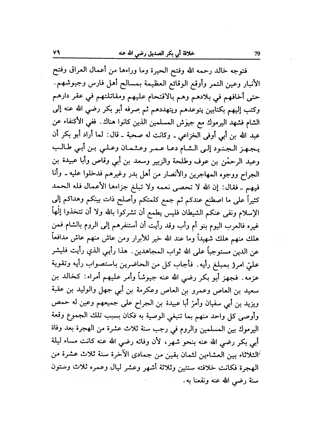 فَتوجه خَالِد رَحمَه الله وَفتح الْحيرَة وَمَا وَرَاءَهَا من أَعمال الْعرَاق وَفتح الأنبار وَعين التَّمْر وأوقع الوقائع الْعَظِيمَة بمسالح أهل فَارس وجيوشهم حَتَّى أَخَافهُم فِي بِلَادهمْ وهم بالاقتحام عَلَيْهِم ومقاتلتهم فِي عقر دَارهم وَكتب إِلَيْهِم بكتابين يتوعدهم ويتهددهم ثمَّ صرفه أَبُو بكر رَضِي الله عَنهُ إِلَى الشَّام فَشهد اليرموك مَعَ جيوش الْمُسلمين الَّذين كَانُوا هُنَاكَ فَفِي الأكنفاء عَن عبد الله بن أبي أوفى الْخُزَاعِيّ وَكَانَت لَهُ صُحْبَة قَالَ لما أَرَادَ أَبُو بكر أَن يُجهز الْجنُود إِلَى الشَّام دَعَا عمر وَعُثْمَان وَعلي بن أبي طَالب وَعبد الرَّحْمَن بن عَوْف وَطَلْحَة وَالزُّبَيْر وَسعد بن أبي وَقاص وَأَبا عُبَيْدَة بن الْجراح ووجوه الْمُهَاجِرين وَالْأَنْصَار من أهل بدر وَغَيرهم فَدَخَلُوا عَلَيْهِ وَأَنا فيهم فَقَالَ إِن الله لَا تحصى نعمه وَلَا تبلغ جزاءها الْأَعْمَال فَلهُ الْحَمد كثيرا على مَا اصْطنع عنْدكُمْ ثمَّ جمع كلمتكم وَأصْلح ذَات بَيْنكُم وهداكم إِلَى الْإِسْلَام وَنفى عَنْكُم الشَّيْطَان فَلَيْسَ يطْمع أَن تُشْرِكُوا بِاللَّه وَلَا أَن تَتَّخِذُوا إِلَهًا غَيره فالعرب الْيَوْم بَنو أم وَأب وَقد رَأَيْت أَن أستنفرهم إِلَى الرّوم بِالشَّام فَمن هلك مِنْهُم هلك شَهِيدا وَمَا عِنْد الله خير للأبرار وَمن عَاشَ مِنْهُم عَاشَ مدافعا عَن الدّين مستوجبا على الله ثَوَاب الْمُجَاهدين هَذَا رَأْيِي الَّذِي رَأَيْت فليشر عَليّ امْرُؤ بمبلغ رَأْيه فَأجَاب كل من الْحَاضِرين باستصواب رَأْيه وتقوية عزمه فَجهز أَبُو بكر رَضِي الله عَنهُ جيوشا وَأمر عَلَيْهِم أُمَرَاء كخالد بن سعيد بن الْعَاصِ وَعَمْرو بن الْعَاصِ وَعِكْرِمَة بن أبي جهل والوليد بن عقبَة وَيزِيد بن أبي سُفْيَان وَأمر أَبَا عُبَيْدَة بن الْجراح على جَمِيعهم وَعين لَهُ حمص وَأوصى كل وَاحِد مِنْهُم بِمَا تنبغي الْوَصِيَّة بِهِ فَكَانَ بِسَبَب تِلْكَ الجموع وقْعَة اليرموك بَين الْمُسلمين وَالروم فِي رَجَب سنة ثَلَاث عشرَة من الْهِجْرَة بعد وَفَاة أبي بكر رَضِي الله عَنهُ بِنَحْوِ شهر لِأَن وَفَاته رَضِي الله عَنهُ كَانَت مسَاء لَيْلَة الثُّلَاثَاء بَين العشاءين لثمان بَقينَ من جُمَادَى الْآخِرَة سنة ثَلَاث عشرَة من الْهِجْرَة فَكَانَت خِلَافَته سنتَيْن وَثَلَاثَة أشهر وَعشرَة لَيَال وعمره ثَلَاث وَسِتُّونَ سنة رَضِي الله عَنهُ ونفعنا بِهِ