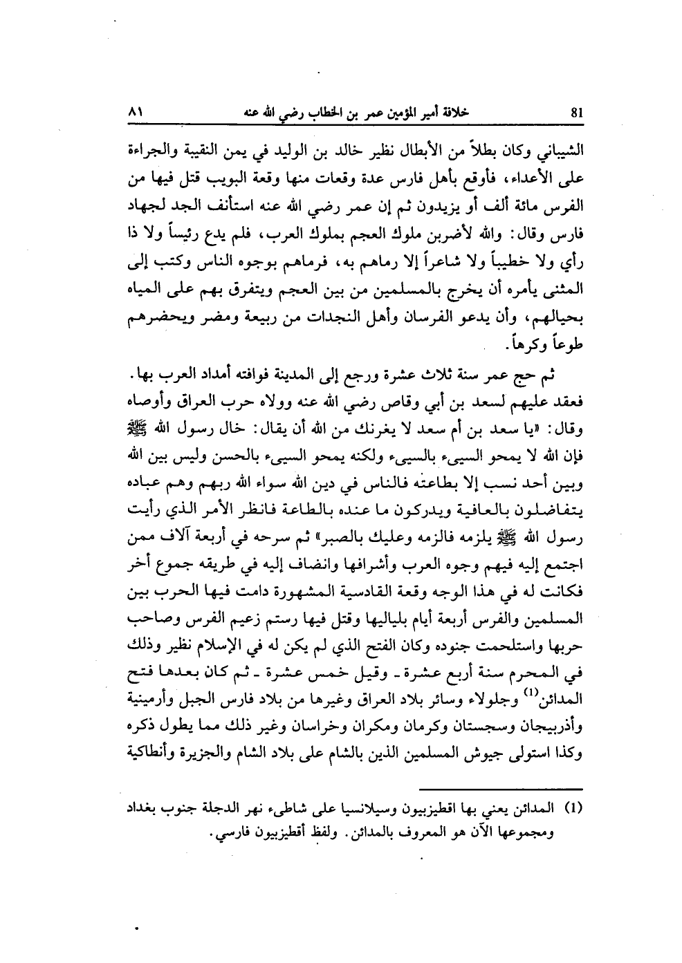 ثمَّ حج عمر سنة ثَلَاث عشرَة وَرجع إِلَى الْمَدِينَة فوافته أَمْدَاد الْعَرَب بهَا فعقد عَلَيْهِم لسعد بن أبي وَقاص رَضِي الله عَنهُ وولاه حَرْب الْعرَاق وأوصاه وَقَالَ يَا سعد بن أم سعد لَا يغرنك من الله أَن يُقَال خَال رَسُول الله صلى الله عَلَيْهِ وَسلم فَإِن الله لَا يمحو السىء بالسىء وَلكنه يمحو السىء بالْحسنِ وَلَيْسَ بَين الله وَبَين أحد نسب إِلَّا بِطَاعَتِهِ فَالنَّاس فِي دين الله سَوَاء الله رَبهم وهم عباده يتفاضلون بالعافية ويدركون مَا عِنْده بِالطَّاعَةِ فَانْظُر الْأَمر الَّذِي رَأَيْت رَسُول الله صلى الله عَلَيْهِ وَسلم يلْزمه فالزمه وَعَلَيْك بِالصبرِ ثمَّ سرحه فِي أَرْبَعَة آلَاف مِمَّن اجْتمع إِلَيْهِ فيهم وُجُوه الْعَرَب وأشرافها وانضاف إِلَيْهِ فِي طَريقَة جموع أخر فَكَانَت لَهُ فِي هَذَا الْوَجْه وقْعَة الْقَادِسِيَّة الْمَشْهُورَة دَامَت فِيهَا الْحَرْب بَين الْمُسلمين وَالْفرس أَرْبَعَة أَيَّام بلياليها وَقتل فِيهَا رستم زعيم الْفرس وَصَاحب حربها واستلحمت جُنُوده وَكَانَ الْفَتْح الَّذِي لم يكن لَهُ فِي الْإِسْلَام نَظِير وَذَلِكَ فِي الْمحرم سنة أَربع عشرَة وَقيل خمس عشرَة ثمَّ كَانَ بعْدهَا فتح الْمَدَائِن وجلولاء وَسَائِر بِلَاد الْعرَاق وَغَيرهَا من بِلَاد فَارس الْجَبَل وأرمينية وأذربيجان وسجستان وكرمان ومكران وخراسان وَغير ذَلِك مِمَّا يطول ذكره وَكَذَا استولى جيوش الْمُسلمين الَّذين بِالشَّام على بِلَاد الشَّام والجزيرة وأنطاكية