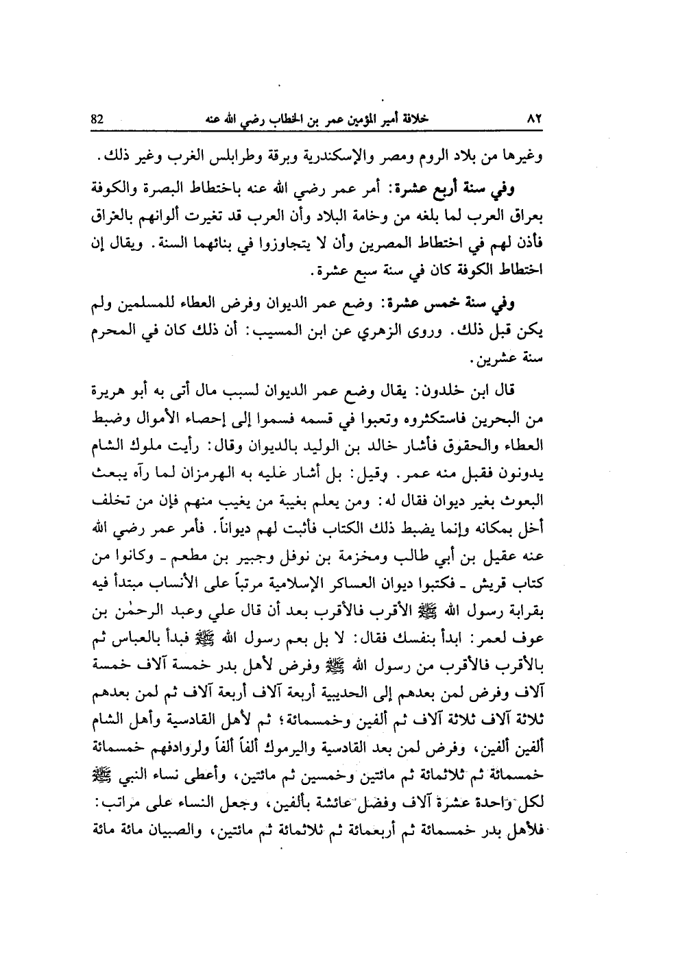 قَالَ ابْن خلدون يُقَال وضع عمر الدِّيوَان لسَبَب مَال أَتَى بِهِ أَبُو هُرَيْرَة من الْبَحْرين فاستكثروه وتعبوا فِي قسْمَة فسموا إِلَى إحصاء الْأَمْوَال وَضبط الْعَطاء والحقوق فَأَشَارَ خَالِد بن الْوَلِيد بالديوان وَقَالَ رَأَيْت مُلُوك الشَّام يدونون فَقبل مِنْهُ عمر وَقيل بل أَشَارَ عَلَيْهِ بِهِ الهرمزان لما رَآهُ يبْعَث الْبعُوث بِغَيْر ديوَان فَقَالَ لَهُ وَمن يعلم بغيبة من يغيب مِنْهُم فَإِن من تخلف أخل بمكانه وَإِنَّمَا يضْبط ذَلِك الْكتاب فَأثْبت لَهُم ديوانا فَأمر عمر رَضِي الله عَنهُ عقيل بن أبي طَالب ومخزمة بن نَوْفَل وَجبير بن مطعم وَكَانُوا من كتاب قُرَيْش فَكَتَبُوا ديوَان العساكر الإسلامية مُرَتبا على الْأَنْسَاب مُبْتَدأ فِيهِ بِقرَابَة رَسُول الله صلى الله عَلَيْهِ وَسلم الْأَقْرَب فَالْأَقْرَب بعد أَن قَالَ عَليّ وَعبد الرَّحْمَن بن عَوْف لعمر ابدأ بِنَفْسِك فَقَالَ لَا بل بعم رَسُول الله صلى الله عَلَيْهِ وَسلم فَبَدَأَ بِالْعَبَّاسِ ثمَّ بالأقرب فَالْأَقْرَب من رَسُول الله صلى الله عَلَيْهِ وَسلم وَفرض لأهل بدر خَمْسَة آلَاف خَمْسَة آلَاف وَفرض لمن بعدهمْ إِلَى الْحُدَيْبِيَة أَرْبَعَة آلَاف أَرْبَعَة آلَاف ثمَّ لمن بعدهمْ ثَلَاثَة آلَاف ثَلَاثَة آلَاف ثمَّ أَلفَيْنِ وَخَمْسمِائة ثمَّ لأهل الْقَادِسِيَّة وَأهل الشَّام أَلفَيْنِ أَلفَيْنِ وَفرض لمن بعد الْقَادِسِيَّة واليرموك ألفا ألفا ولروادفهم خَمْسمِائَة خَمْسمِائَة ثمَّ ثَلَاثمِائَة ثمَّ مِائَتَيْنِ وَخمسين ثمَّ مِائَتَيْنِ وَأعْطى نسَاء النَّبِي صلى الله عَلَيْهِ وَسلم لكل وَاحِدَة عشرَة آلَاف وَفضل عَائِشَة بِأَلفَيْنِ وَجعل النِّسَاء على مَرَاتِب فلأهل بدر خَمْسمِائَة ثمَّ أَرْبَعمِائَة ثمَّ ثَلَاثمِائَة ثمَّ مِائَتَيْنِ وَالصبيان مائَة مائَة