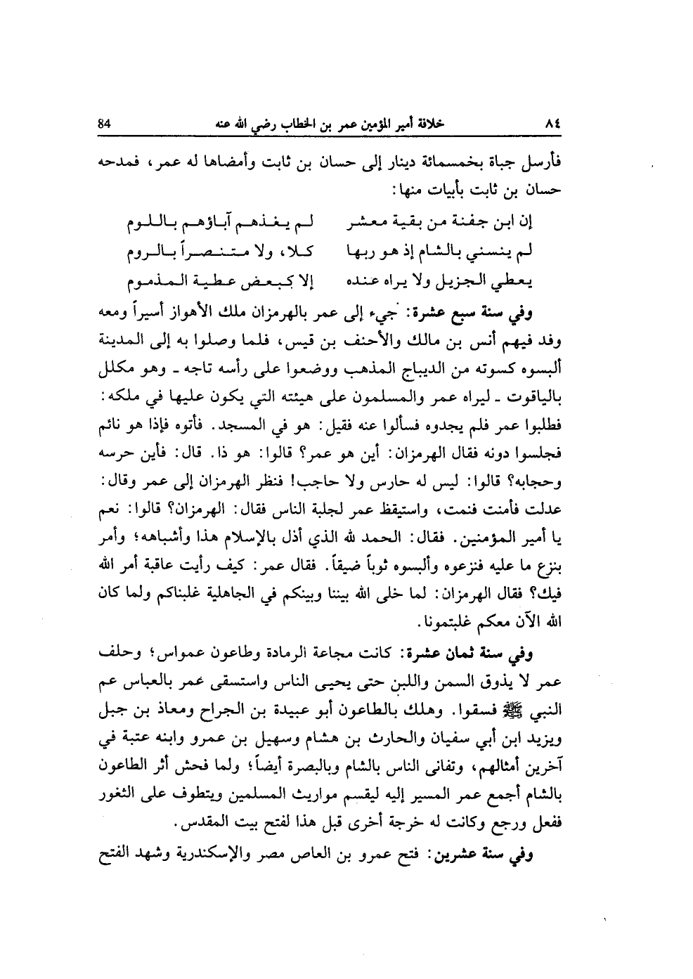وَفِي سنة سبع عشرَة جِيءَ إِلَى عمر بالهرمزان ملك الأهواز أَسِيرًا وَمَعَهُ وَفد فيهم أنس بن مَالك والأحنف بن قيس فَلَمَّا وصلوا بِهِ إِلَى الْمَدِينَة ألبسوه كسوته من الديباج الْمَذْهَب وَوَضَعُوا على رَأسه تاجه وَهُوَ مكلل بالياقوت ليراه عمر والمسلمون على هَيئته الَّتِي يكون عَلَيْهَا فِي ملكه فطلبوا عمر فَلم يجدوه فسألوا عَنهُ فَقيل هُوَ فِي الْمَسْجِد فَأتوهُ فَإِذا هُوَ نَائِم فجلسوا دونه فَقَالَ الهرمزان أَيْن هُوَ عمر قَالُوا هُوَ ذَا قَالَ فَأَيْنَ حرسه وحجابه قَالُوا لَيْسَ لَهُ حارس وَلَا حَاجِب فَنظر الهرمزان إِلَى عمر وَقَالَ عدلت فأمنت فَنمت واستيقظ عمر لجلبة النَّاس فَقَالَ الهرمزان قَالُوا نعم يَا أَمِير الْمُؤمنِينَ فَقَالَ الْحَمد لله الَّذِي أذلّ بِالْإِسْلَامِ هَذَا وأشباهه وَأمر بِنَزْع مَا عَلَيْهِ فَنَزَعُوهُ وألبسوه ثوبا ضيقا فَقَالَ عمر كَيفَ رَأَيْت عَاقِبَة أَمر الله فِيك فَقَالَ الهرمزان لما خلى الله بَيْننَا وَبَيْنكُم فِي الْجَاهِلِيَّة غلبناكم وَلما كَانَ الله الْآن مَعكُمْ غلبتمونا