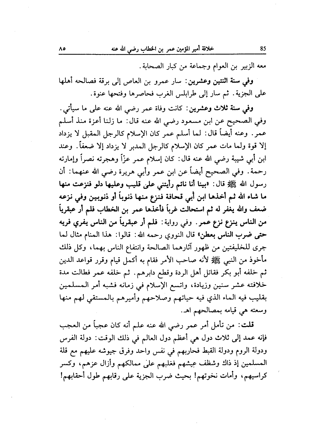 قلت من تَأمل أَمر عمر رَضِي الله عَنهُ علم أَنه كَانَ عجبا من الْعجب فَإِنَّهُ عمد إِلَى ثَلَاث دوَل هِيَ أعظم دوَل الْعَالم فِي ذَلِك الْوَقْت دولة الْفرس ودولة الرّوم ودولة القبط فحاربهم فِي نفس وَاحِد وَفرق جيوشه عَلَيْهِم مَعَ قلَّة الْمُسلمين إِذْ ذَاك وشظف عيشهم فَغَلَبَهُمْ على ممالكهم وأزال عزهم وَكسر كراسيهم وأمات نخوتهم بِحَيْثُ ضرب الْجِزْيَة على رقابهم طول أحقابهم