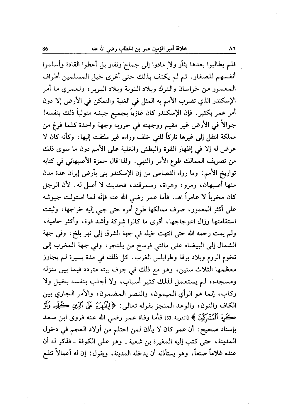 فَلم يطالبوا بعْدهَا بثأر وَلَا عَادوا إِلَى جماح ونفار بل أعْطوا القادة وَأَسْلمُوا أنفسهم للصغار ثمَّ لم يكتف بذلك حَتَّى أغزى خيل الْمُسلمين أَطْرَاف الْمَعْمُور من خُرَاسَان وَالتّرْك وبلاد النّوبَة وبلاد البربر ولعمري مَا أَمر الْإِسْكَنْدَر الَّذِي تضرب الْأُمَم بِهِ الْمثل فِي الْغَلَبَة والتمكن فِي الأَرْض إِلَّا دون أَمر عمر بِكَثِير فَإِن الْإِسْكَنْدَر كَانَ غازيا بِجَمِيعِ جَيْشه مُتَوَلِّيًا ذَلِك بِنَفسِهِ جوالا فِي الأَرْض غير مُقيم ووجهته فِي حروبه وجهة وَاحِدَة كلما فرغ من مملكة انْتقل إِلَى غَيرهَا تَارِكًا للَّتِي خلف وَرَاءه غير ملتفت إِلَيْهَا وَكَأَنَّهُ كَانَ لَا عرض لَهُ إِلَّا فِي إِظْهَار الْقُوَّة والبطش وَالْغَلَبَة على الْأُمَم دون مَا سوى ذَلِك من تصريف الممالك طوع الْأَمر وَالنَّهْي وَلذَا قَالَ حَمْزَة الْأَصْبَهَانِيّ فِي كِتَابه تواريخ الْأُمَم وَمَا رَوَاهُ الْقصاص من إِن الْإِسْكَنْدَر بنى بِأَرْض إيران عدَّة مدن مِنْهَا أَصْبَهَان ومرو وهراة وسمرقند فَحَدِيث لَا أصل لَهُ لِأَن الرجل كَانَ مخربا لَا عَامِرًا اه فَأَما عمر رَضِي الله عَنهُ فَإِنَّهُ لما استولت جيوشه على أَكثر الْمَعْمُور صرف ممالكها طوع أمره حَتَّى جبي إِلَيْهِ خراجها وَثبتت استقامتها وَزَالَ اعوجاجها أقوى مَا كَانُوا شَوْكَة وَأَشد قُوَّة واكثر حامية وَلم يمت رَحمَه الله حَتَّى انْتَهَت خيله فِي جِهَة الشرق إِلَى نهر بَلخ وَفِي جِهَة الشمَال إِلَى الْبَيْضَاء على مِائَتي فَرسَخ من بلنجر وَفِي جِهَة الْمغرب إِلَى تخوم الرّوم وبلاد برقة وطرابلس الغرب كل ذَلِك فِي مُدَّة يسيرَة لم يُجَاوز معظمها الثَّلَاث سِنِين وَهُوَ مَعَ ذَلِك فِي جَوف بَيته مُتَرَدّد فِيمَا بَين منزله ومسجده لم يسْتَعْمل لذَلِك كثير أَسبَاب وَلَا أجلب بِنَفسِهِ بخيل وَلَا ركاب إِنَّمَا هُوَ الرَّأْي الميمون والنصر الْمَضْمُون وَالْأَمر الْجَارِي بَين الْكَاف وَالنُّون والوعد الْمُنجز بقوله تَعَالَى {لِيظْهرهُ على الدّين كُله وَلَو كره الْمُشْركُونَ} فَأَما وَفَاة عمر رَضِي الله عَنهُ فروى ابْن سعد بِإِسْنَاد صَحِيح أَن عمر كَانَ لَا يَأْذَن لمن احْتَلَمَ من أَوْلَاد الْعَجم فِي دُخُول الْمَدِينَة حَتَّى كتب إِلَيْهِ الْمُغيرَة بن شُعْبَة وَهُوَ على الْكُوفَة فَذكر لَهُ أَن عِنْده غُلَاما صنعا وَهُوَ يَسْتَأْذِنهُ أَن يدْخلهُ الْمَدِينَة وَيَقُول إِن لَهُ أعمالا تَنْفَع