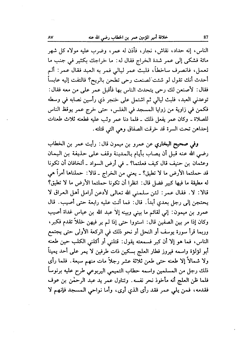 وَفِي صَحِيح البُخَارِيّ عَن عَمْرو بن مَيْمُون قَالَ رَأَيْت عمر بن الْخطاب رَضِي الله عَنهُ قبل أَن يصاب بأيام بِالْمَدِينَةِ وقف على حُذَيْفَة بن الْيَمَان وَعُثْمَان بن حنيف قَالَ كَيفَ فعلتما فِي أَرض السوَاد أتخافان أَن تَكُونَا قد حملتما الأَرْض مَا لَا تطِيق يَعْنِي من الْخراج قَالَا حملناها أمرا هِيَ لَهُ مطيقة مَا فِيهَا كَبِير فضل قَالَ انظرا أَن تَكُونَا حملتما الأَرْض مَا لَا تطِيق قَالَا لَا فَقَالَ عمر لَئِن سلمني الله تَعَالَى لأدعن أرامل أهل الْعرَاق لَا يحتجن إِلَى رجل بعدِي أبدا قَالَ فَمَا أَتَت عَلَيْهِ رَابِعَة حَتَّى أُصِيب قَالَ عَمْرو بن مَيْمُون إِنِّي لقائم مَا بيني وَبَينه إِلَّا عبد الله بن عَبَّاس غَدَاة أُصِيب وَكَانَ إِذا مر بَين الصفين قَالَ اسْتَووا حَتَّى إِذا لم ير فِيهِنَّ خللا تقدم فَكبر وَرُبمَا قَرَأَ سُورَة يُوسُف أَو النَّحْل أَو نَحْو ذَلِك فِي الرَّكْعَة الأولى حَتَّى يجْتَمع النَّاس فَمَا هُوَ إِلَّا أَن كبر فَسَمعته يَقُول قتلني أَو أكلني الْكَلْب حِين طعنه أَبُو لؤلؤة واسْمه فَيْرُوز فطار العلج بسكين ذَات طرفين لَا يمر على أحد يَمِينا وَلَا شمالا إِلَّا طعنه حَتَّى طعن ثَلَاثَة عشر رجلا مَاتَ مِنْهُم سَبْعَة فَلَمَّا رأى ذَلِك رجل من الْمُسلمين واسْمه حطاب التَّمِيمِي الْيَرْبُوعي طرح عَلَيْهِ برنوسا فَلَمَّا ظن العلج أَنه مَأْخُوذ نحر نَفسه وَتَنَاول عمر يَد عبد الرَّحْمَن بن عَوْف فقدمه فَمن يَلِي عمر فقد رأى الَّذِي أرى وَأما نواحي الْمَسْجِد فَإِنَّهُم لَا