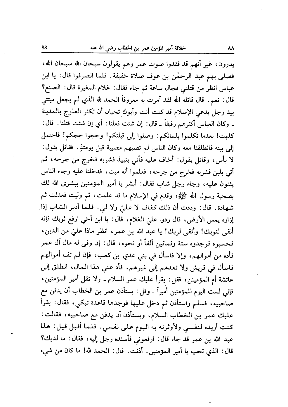 يَدْرُونَ غير أَنهم قد فقدوا صَوت عمر وهم يَقُولُونَ سُبْحَانَ الله سُبْحَانَ الله فصلى بهم عبد الرَّحْمَن بن عَوْف صَلَاة خَفِيفَة فَلَمَّا انصرفوا قَالَ يَا ابْن عَبَّاس انْظُر من قتلني فجال سَاعَة ثمَّ جَاءَ فَقَالَ غُلَام الْمُغيرَة قَالَ الصنع قَالَ نعم قَالَ قَاتله الله لقد أمرت بِهِ مَعْرُوفا الْحَمد لله الَّذِي لم يَجْعَل ميتتي بيد رجل يَدعِي الْإِسْلَام قد كنت أَنْت وَأَبُوك تحبان أَن تكْثر العلوج بِالْمَدِينَةِ وَكَانَ الْعَبَّاس أَكْثَرهم رَقِيقا قَالَ إِن شِئْت فعلنَا أَي إِن شِئْت قتلنَا قَالَ كذبت بَعْدَمَا تكلمُوا بلسانكم وصلوا إِلَى قبلتكم وحجوا حَجكُمْ فَاحْتمل إِلَى بَيته فَانْطَلَقْنَا مَعَه وَكَانَ النَّاس لم تصبهم مُصِيبَة قبل يَوْمئِذٍ فَقَائِل يَقُول لَا بَأْس وَقَائِل يَقُول أَخَاف عَلَيْهِ فَأتي بنبيذ فشربه فَخرج من جرحه ثمَّ أُتِي بِلَبن فشربه فَخرج من جرحه فَعَلمُوا أَنه ميت فَدَخَلْنَا عَلَيْهِ وَجَاء النَّاس يثنون عَلَيْهِ وَجَاء رجل شَاب فَقَالَ أبشر يَا أَمِير الْمُؤمنِينَ ببشرى الله لَك بِصُحْبَة رَسُول الله صلى الله عَلَيْهِ وَسلم وَقدم فِي الْإِسْلَام مَا قد علمت ثمَّ وليت فعدلت ثمَّ شَهَادَة قَالَ وددت أَن ذَلِك كفاف لَا عَليّ وَلَا لي فَلَمَّا أدبر الشَّاب إِذا إزَاره يمس الأَرْض قَالَ ردوا عَليّ الْغُلَام قَالَ يَا ابْن أخي ارْفَعْ ثَوْبك فَإِنَّهُ أنقى لثوبك وَأتقى لِرَبِّك يَا عبد الله بن عمر انْظُر مَاذَا عَليّ من الدّين فحسبوه فوجدوه سِتَّة وَثَمَانِينَ ألفا أَو نَحوه قَالَ إِن وفى لَهُ مَال آل عمر فأده من أَمْوَالهم وَإِلَّا فاسأل فِي بني عدي بن كَعْب فَإِن لم تف أَمْوَالهم فاسأل فِي قُرَيْش وَلَا تعدهم إِلَى غَيرهم فأد عني هَذَا المَال انْطلق إِلَى عَائِشَة أم الْمُؤمنِينَ فَقل يقْرَأ عَلَيْك عمر السَّلَام وَلَا تقل أَمِير الْمُؤمنِينَ فَإِنِّي لست الْيَوْم للْمُؤْمِنين أَمِيرا وَقل يسْتَأْذن عمر بن الْخطاب أَن يدْفن مَعَ صَاحِبيهِ فَسلم وَاسْتَأْذَنَ ثمَّ دخل عَلَيْهَا فَوَجَدَهَا قَاعِدَة تبْكي فَقَالَ يقْرَأ عَلَيْك عمر بن الْخطاب السَّلَام ويستأذن أَن يدْفن مَعَ صَاحِبيهِ فَقَالَت كنت أريده لنَفْسي ولأوثرنه بِهِ الْيَوْم على نَفسِي فَلَمَّا أقبل قيل هَذَا عبد الله بن عمر قد جَاءَ قَالَ ارفعوني فأسنده رجل إِلَيْهِ فَقَالَ مَا لديك قَالَ الَّذِي تحب يَا أَمِير الْمُؤمنِينَ أَذِنت قَالَ الْحَمد لله مَا كَانَ من شَيْء