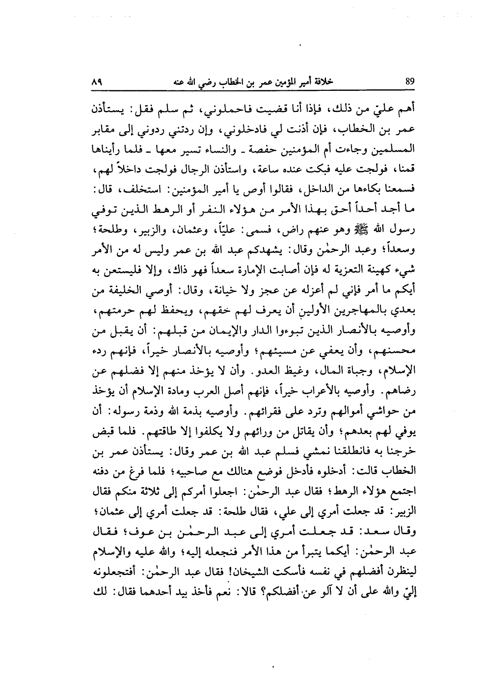 أهم عَليّ من ذَلِك فَإِذا أَنا قضيت فاحملوني ثمَّ سلم فَقل يسْتَأْذن عمر بن الْخطاب فَإِن أَذِنت لي فادخلوني وَإِن ردتني ردوني إِلَى مَقَابِر الْمُسلمين وَجَاءَت أم الْمُؤمنِينَ حَفْصَة وَالنِّسَاء تسير مَعهَا فَلَمَّا رأيناها قمنا فولجت عَلَيْهِ فَبَكَتْ عِنْده سَاعَة وَاسْتَأْذَنَ الرِّجَال فولجت دَاخِلا لَهُم فسمعنا بكاءها من الدَّاخِل فَقَالُوا أوص يَا أَمِير الْمُؤمنِينَ اسْتخْلف قَالَ مَا أجد أحدا أَحَق بِهَذَا الْأَمر من هَؤُلَاءِ النَّفر أَو الرَّهْط الَّذين توفّي رَسُول الله صلى الله عَلَيْهِ وَسلم وَهُوَ عَنْهُم رَاض فَسمى عليا وَعُثْمَان وَالزُّبَيْر وَطَلْحَة وسعدا وَعبد الرَّحْمَن وَقَالَ يشهدكم عبد الله بن عمر وَلَيْسَ لَهُ من الْأَمر شَيْء كهينة التَّعْزِيَة لَهُ فَإِن أَصَابَت الْإِمَارَة سَعْدا فَهُوَ ذَاك وَإِلَّا فليستعن بِهِ أَيّكُم مَا أَمر فَإِنِّي لم أعزله عَن عجز وَلَا خِيَانَة وَقَالَ أوصِي الْخَلِيفَة من بعدِي بالمهاجرين الْأَوَّلين أَن يعرف لَهُم حَقهم ويحفظ لَهُم حرمتهم وأوصيه بالأنصار الَّذين تبوءوا الدَّار وَالْإِيمَان من قبلهم أَن يقبل من محسنهم وَأَن يعفي عَن مسيئهم وأوصيه بالأنصار خيرا فَإِنَّهُم ردء الْإِسْلَام وجباة المَال وغيظ الْعَدو وَأَن لَا يُؤْخَذ مِنْهُم إِلَّا فَضلهمْ عَن رضاهم وأوصيه بالأعراب خيرا فَإِنَّهُم أصل الْعَرَب ومادة الْإِسْلَام أَن يُؤْخَذ من حَوَاشِي أَمْوَالهم وَترد على فقرائهم وأوصيه بِذِمَّة الله وَذمَّة رَسُوله أَن يُوفي لَهُم بعدهمْ وَأَن يُقَاتل من ورائهم وَلَا يكلفوا إِلَّا طاقتهم فَلَمَّا قبض خرجنَا بِهِ فَانْطَلَقْنَا نمشي فَسلم عبد الله بن عمر وَقَالَ يسْتَأْذن عمر بن الْخطاب قَالَت أدخلوه فَأدْخل فَوضع هُنَالك مَعَ صَاحِبيهِ فَلَمَّا فرغ من دَفنه اجْتمع هَؤُلَاءِ الرَّهْط فَقَالَ عبد الرَّحْمَن اجعلوا أَمركُم إِلَى ثَلَاثَة مِنْكُم فَقَالَ الزبير قد جعلت أَمْرِي إِلَى عَليّ فَقَالَ طَلْحَة قد جعلت أَمْرِي إِلَى عُثْمَان وَقَالَ سعد قد جعلت أَمْرِي إِلَى عبد الرَّحْمَن بن عَوْف فَقَالَ عبد الرَّحْمَن أيكما يتبرأ من هَذَا الْأَمر فنجعله إِلَيْهِ وَالله عَلَيْهِ وَالْإِسْلَام لينظرن أفضلهم فِي نَفسه فأسكت الشَّيْخَانِ فَقَالَ عبد الرَّحْمَن أفتجعلونه إِلَيّ وَالله على أَن لَا آلو عَن أفضلكم قَالَا نعم فَأخذ بيد أَحدهمَا فَقَالَ لَك